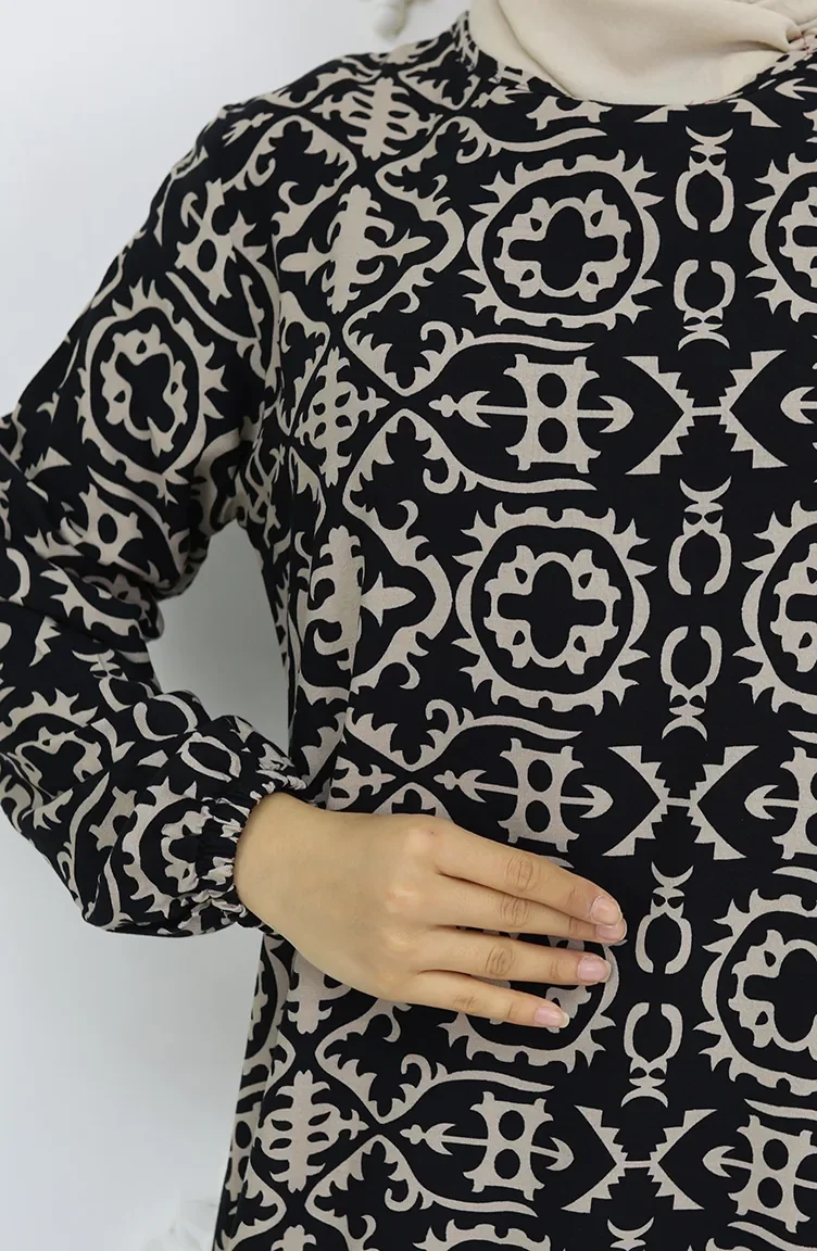 Siyah renktedir. Viskon kumaş. Desenli kumaş. Lastik kollu. Sıfır yaka detayı ile rahat kullanıma sahiptir. 4 Mevsim tercih edebilirsiniz. Rahat. Büyük beden seçeneği mevcuttur.