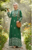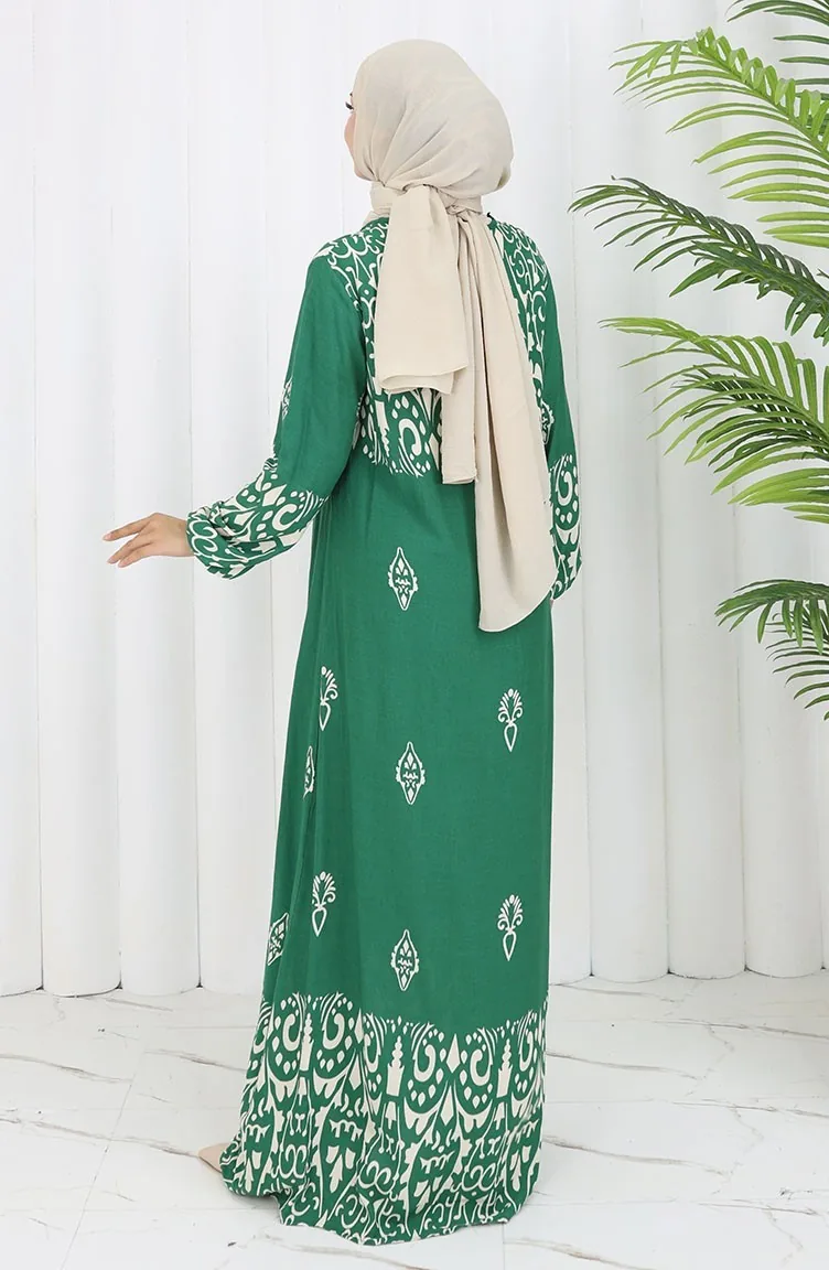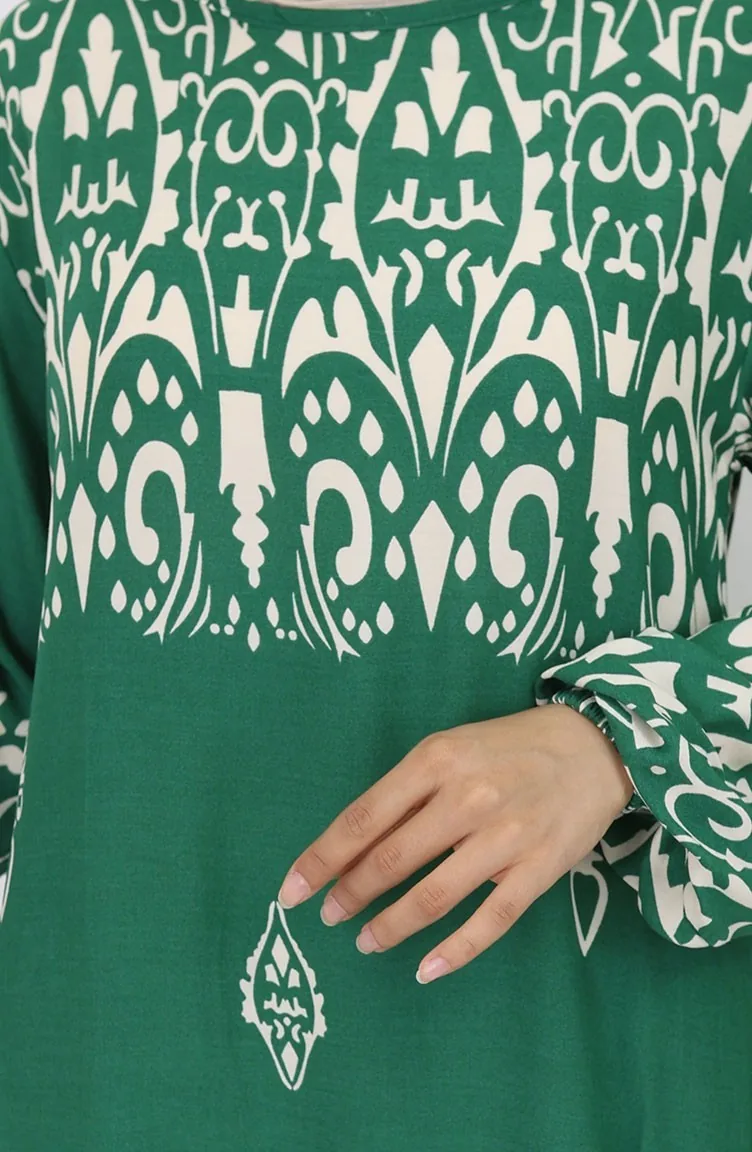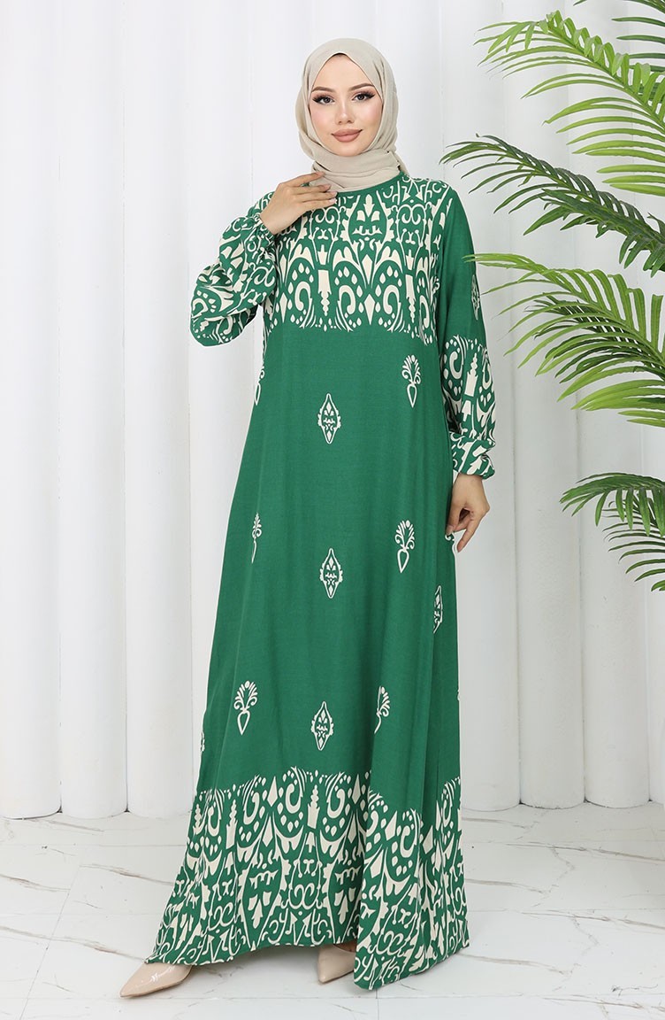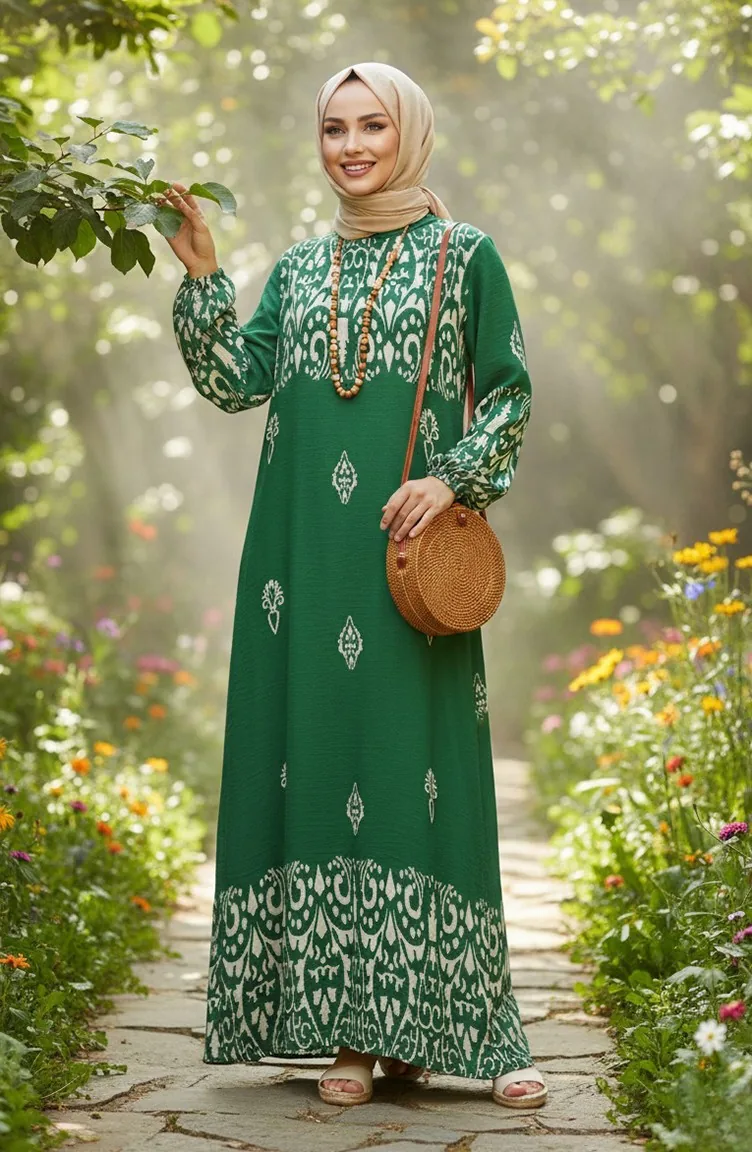 Hijab (tesettür) stilinde doğallığın ve konforun simgesi: zümrüt yeşili desenli viskon elbise. Modest dress (elbise) koleksiyonunuza canlılık katan bu parça, nefes alan Viskon Kumaşı sayesinde gün boyu ferahlık sağlar.