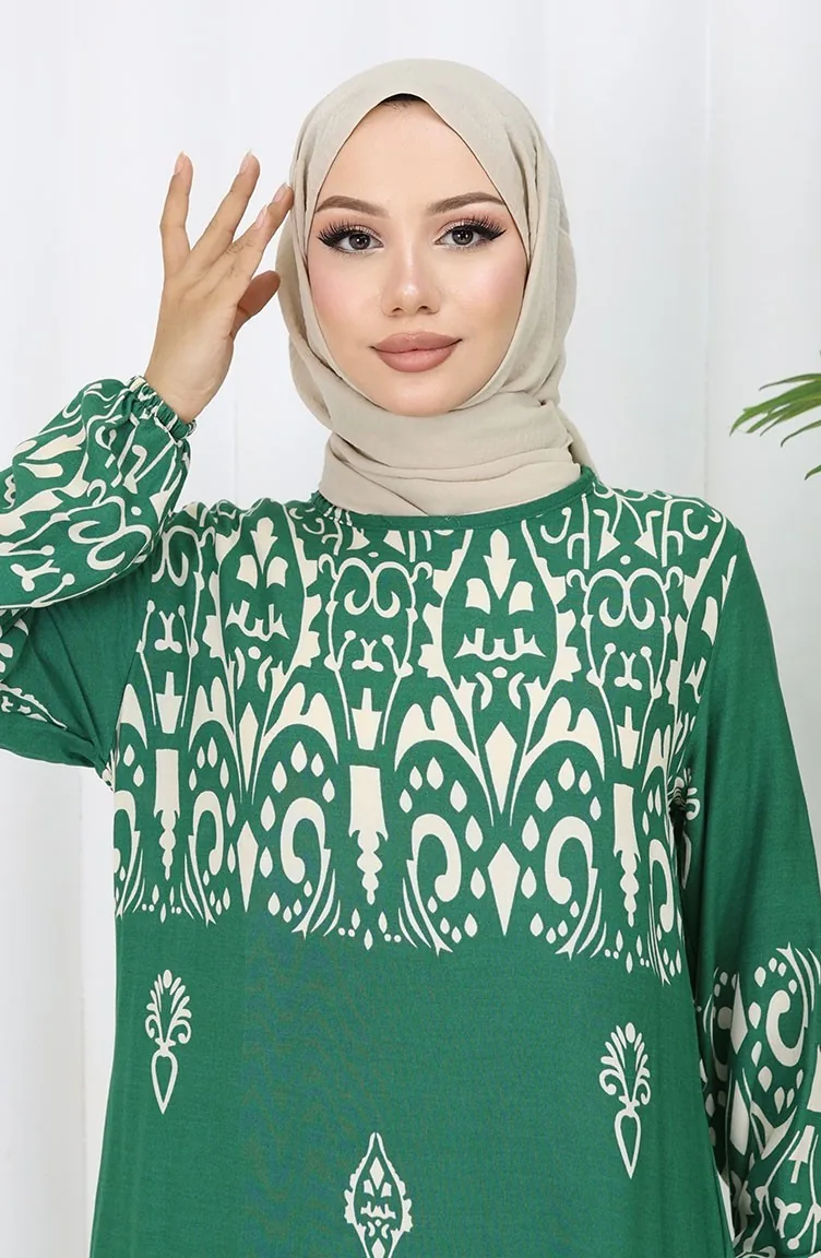 Viskon Kumaş Desenli Elbise 0060-02 Zümrüt Yeşili