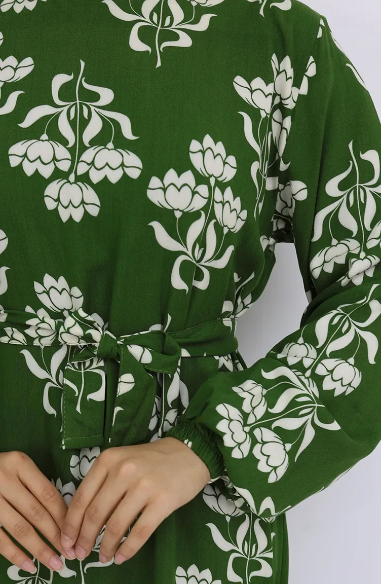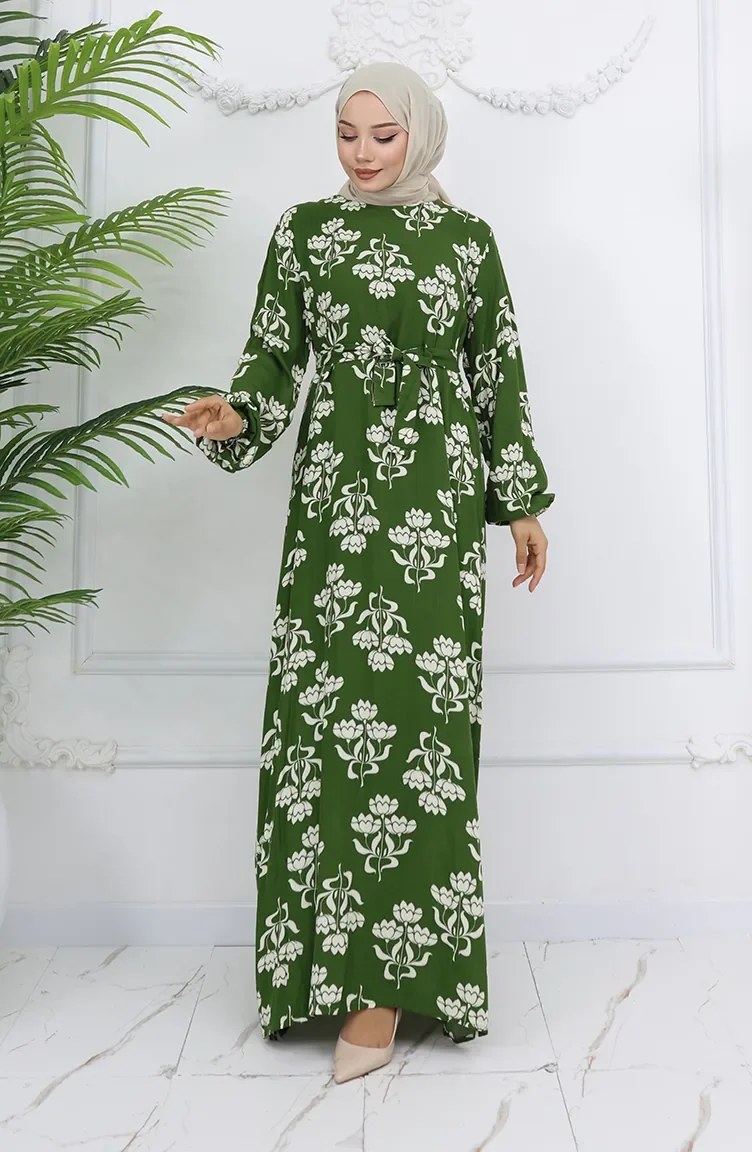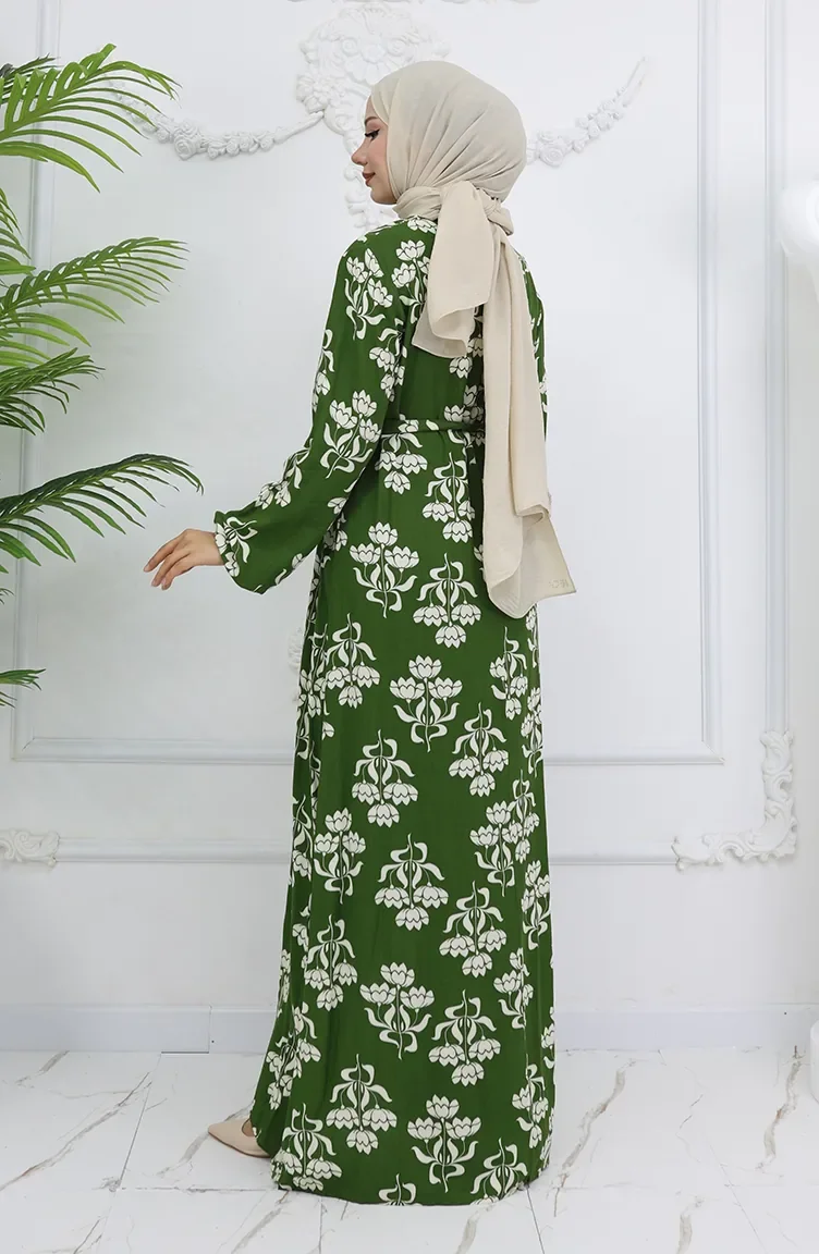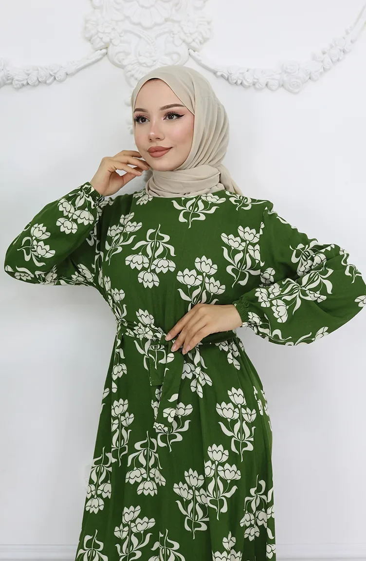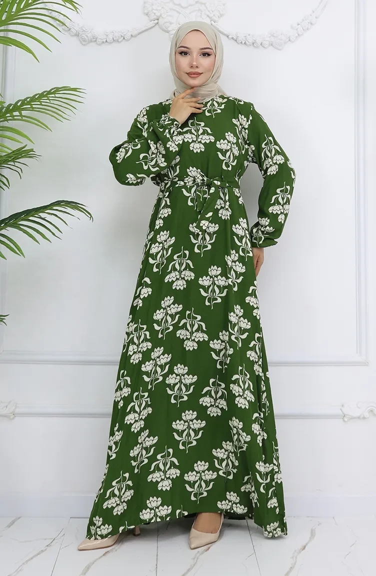 Viskon Kumaş Desenli Kuşaklı Elbise 2009-02 Haki