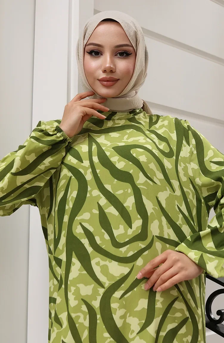 Haki renktedir. Viskon kumaş. Desenli kumaş. Fermuarlı. Lastik kollu. Sıfır yaka detayı ile rahat kullanıma sahiptir. 4 Mevsim tercih edebilirsiniz. Rahat. Büyük beden seçeneği mevcuttur.
