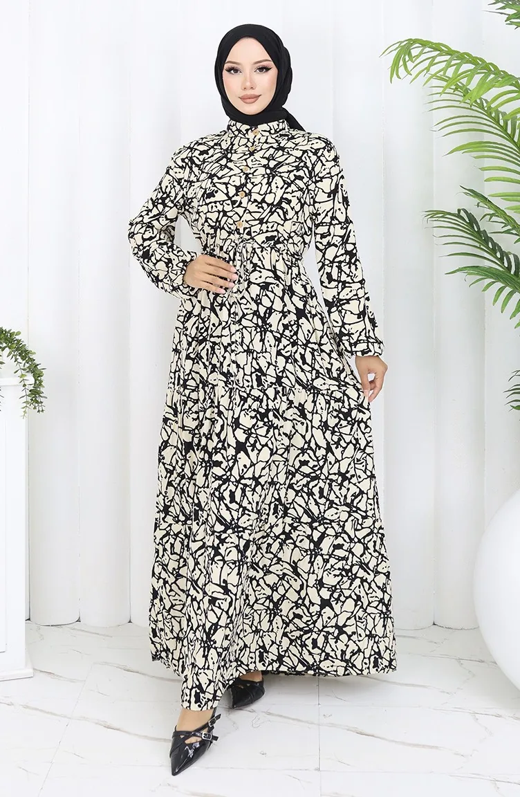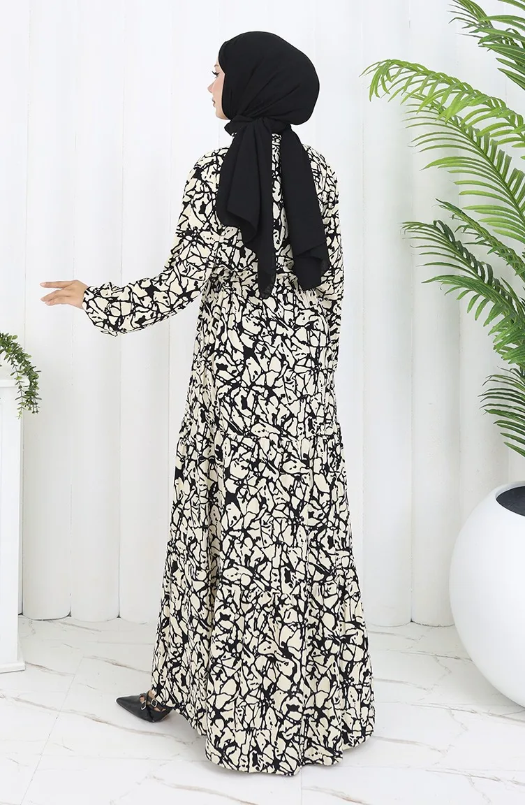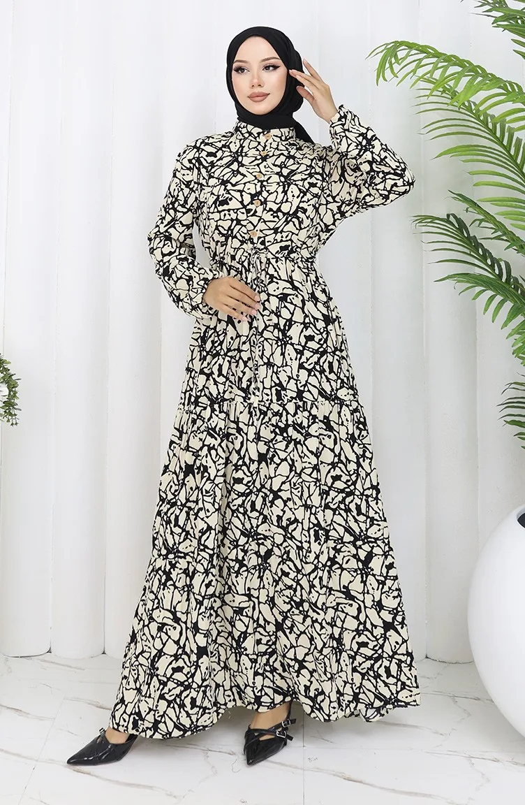 Viskon Kumaş Yarım Düğmeli Desenli Elbise 0087-03 Siyah Bej