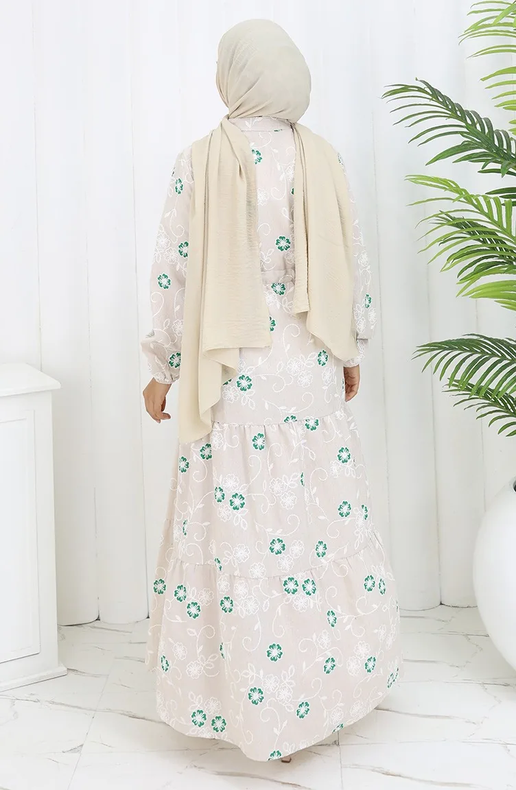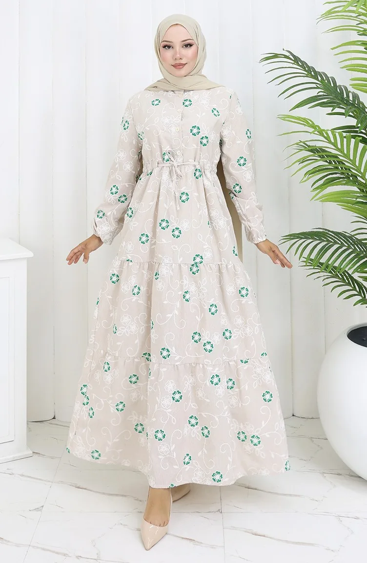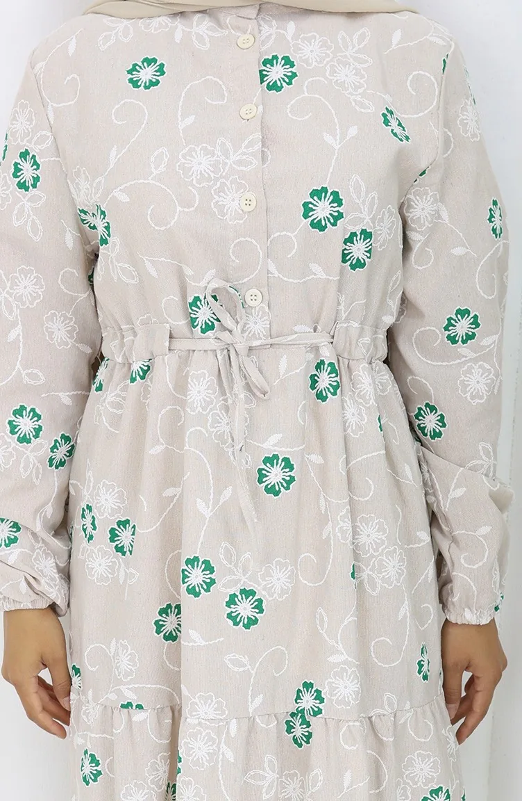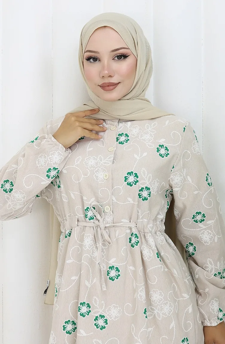 Yarım Düğmeli Keten Elbise 2097-03 Bej Zümrüt Yeşili
