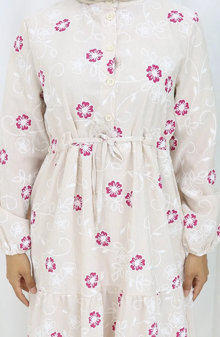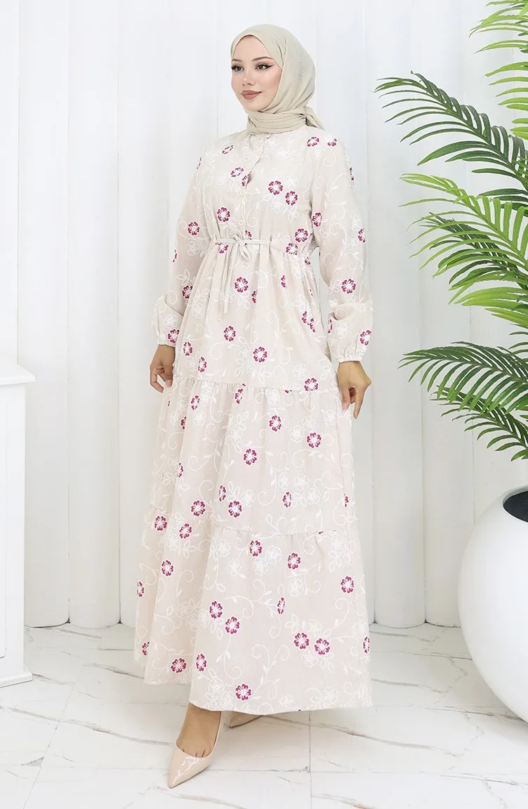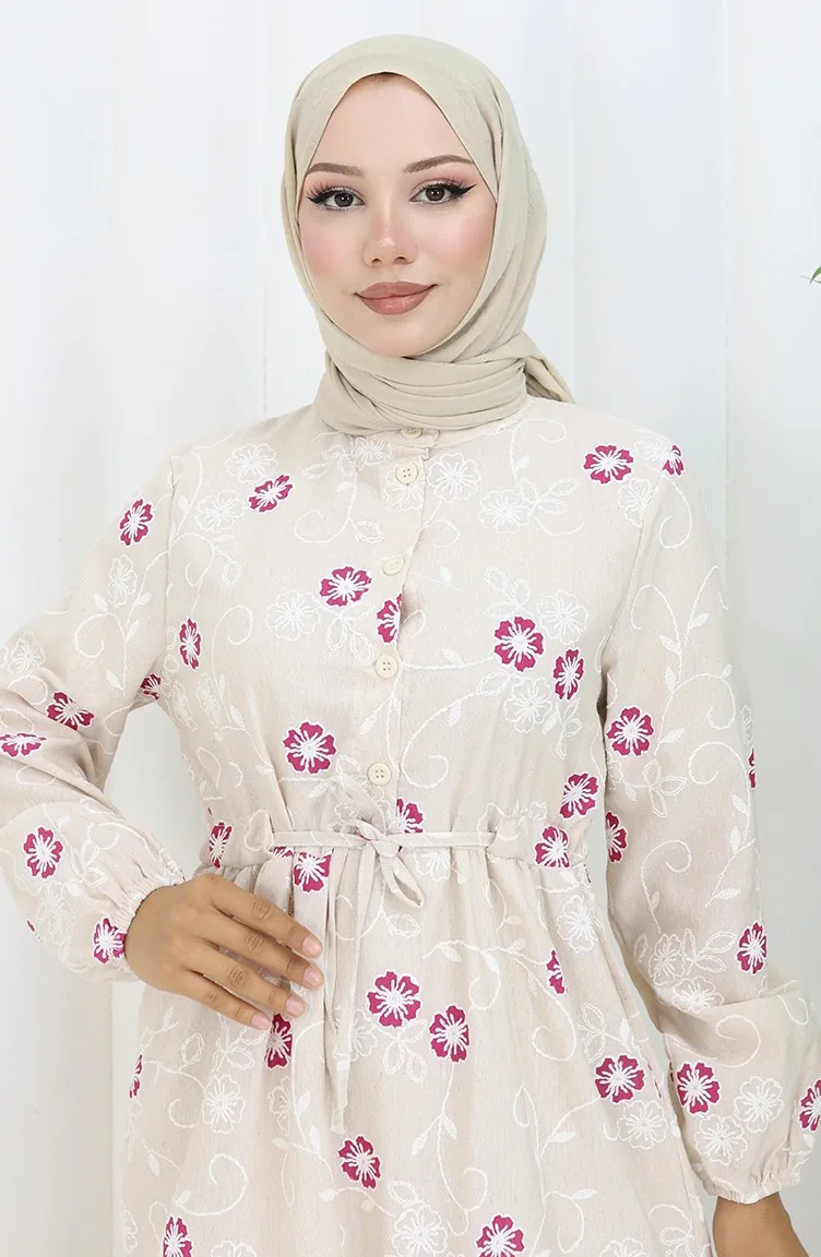 Yarım Düğmeli Keten Elbise 2097-04 Bej Fuşya