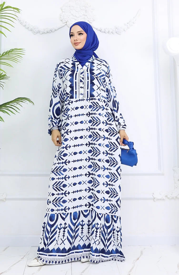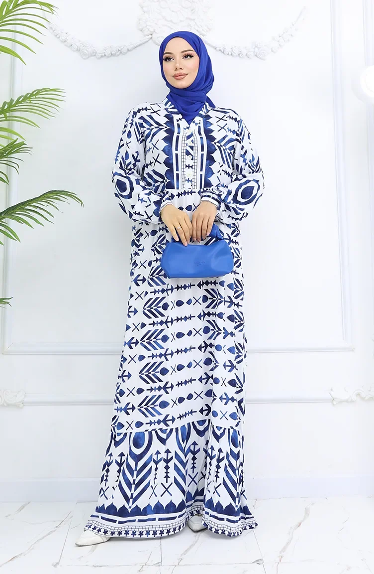 Yarım Düğmeli Viskon Desenli Elbise 0026-03 Lacivert Beyaz