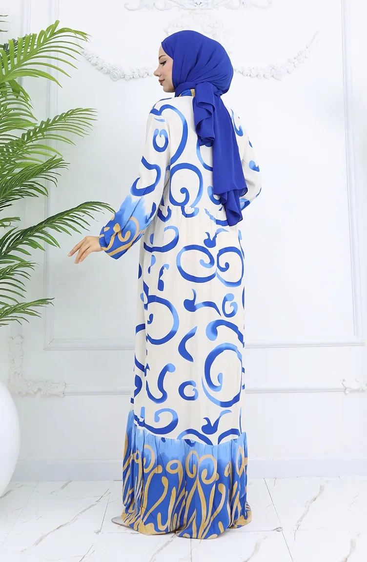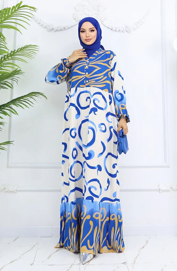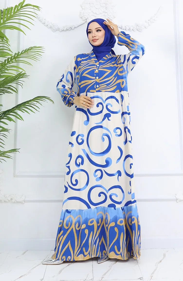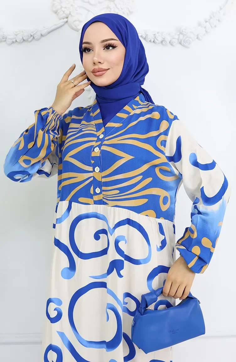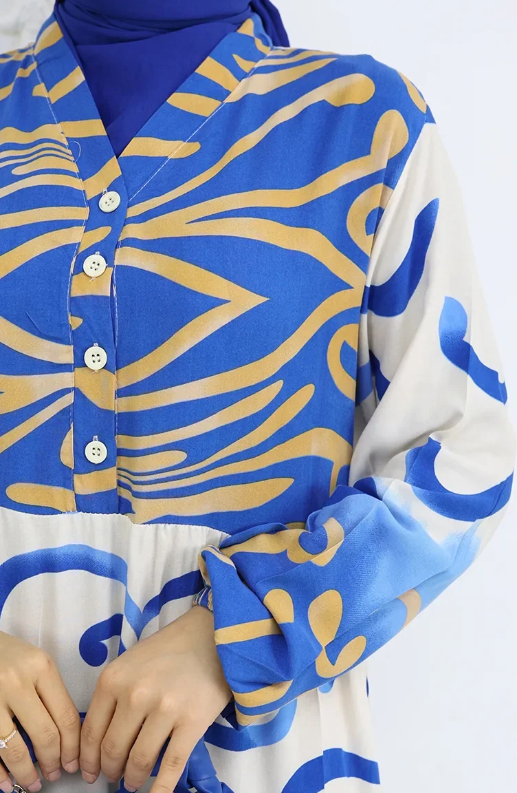 Yarım Düğmeli Viskon Desenli Elbise 0028-01 Saks Bej