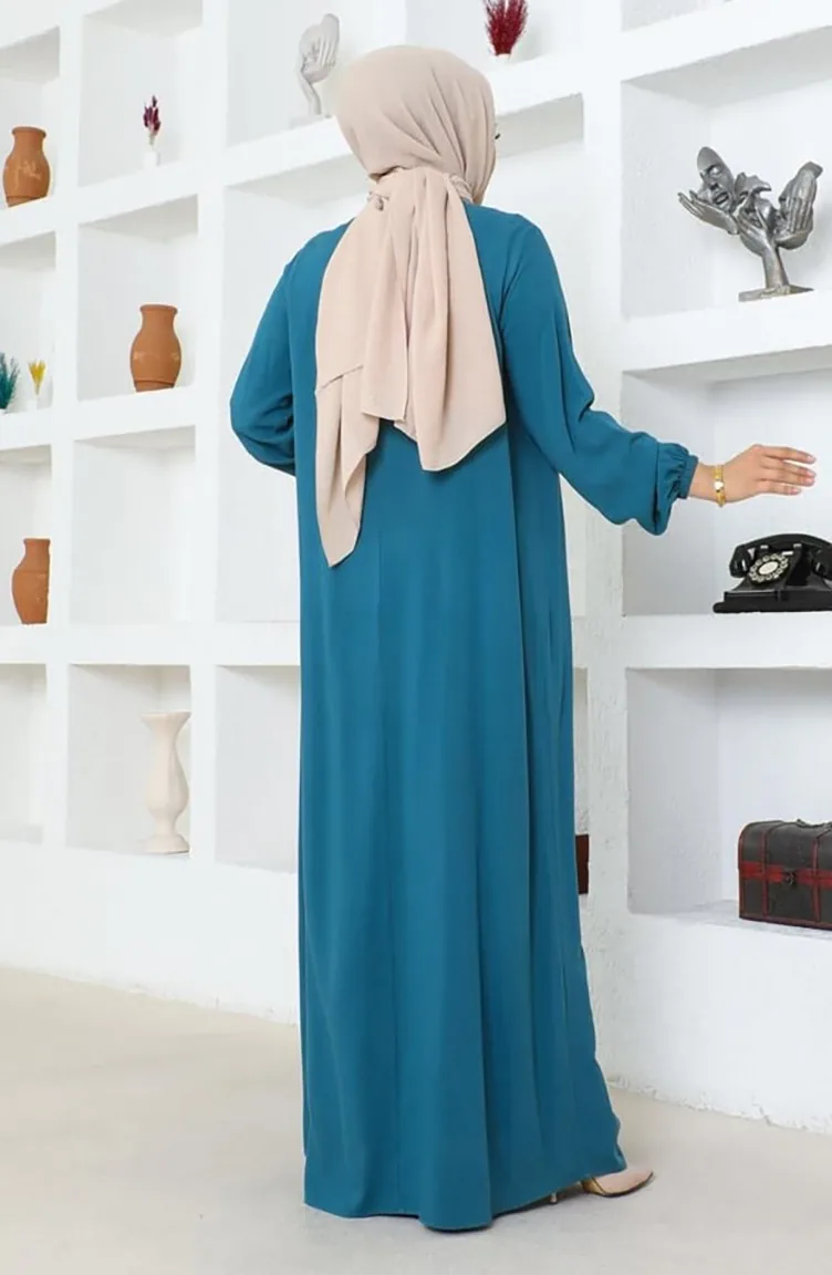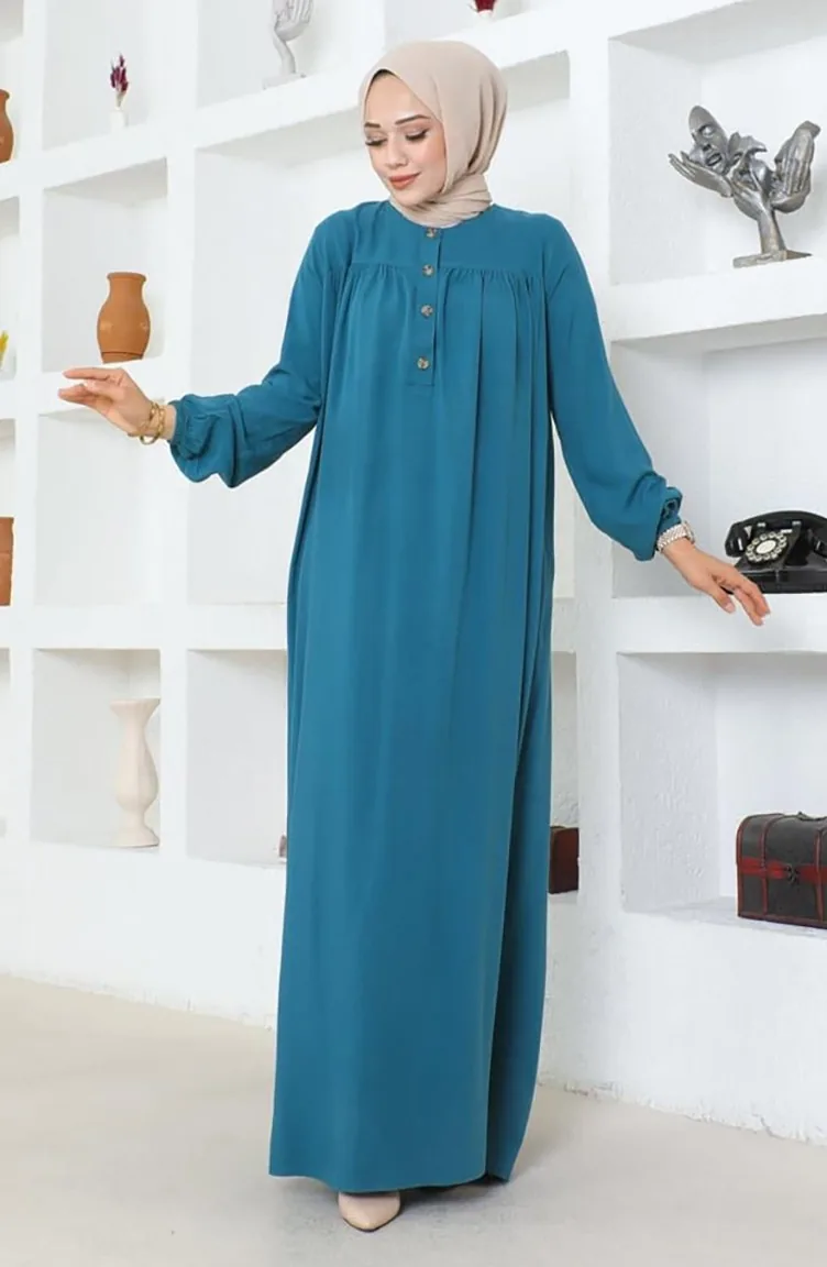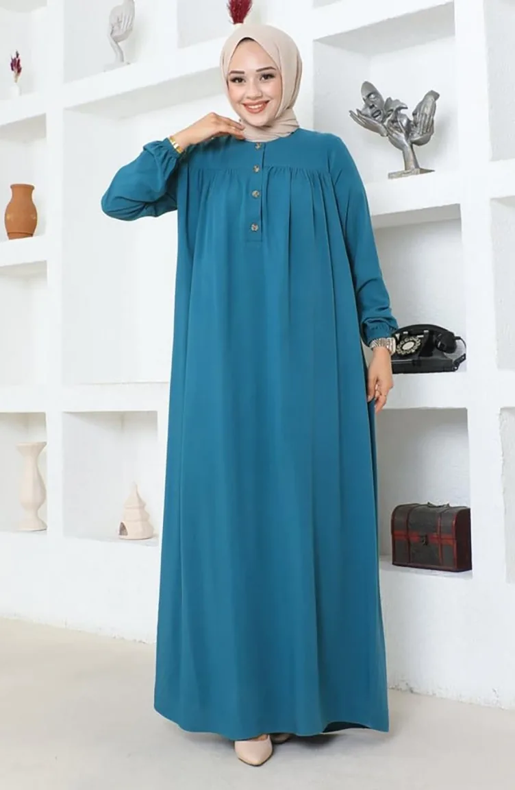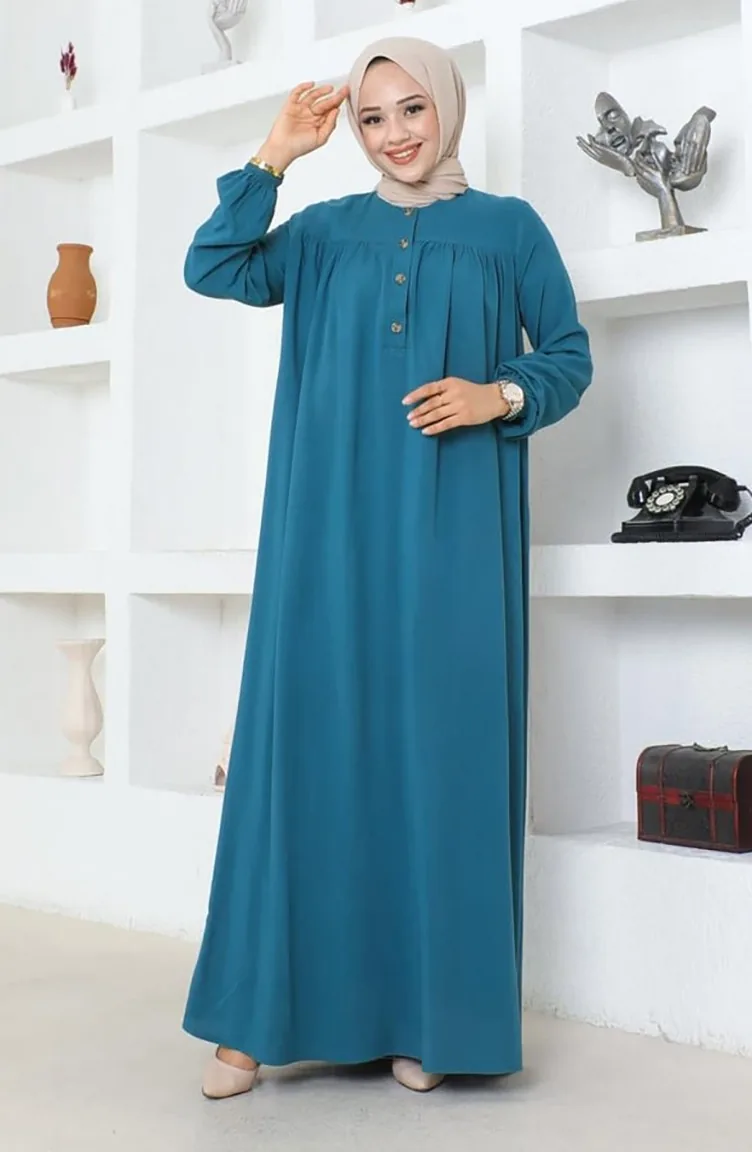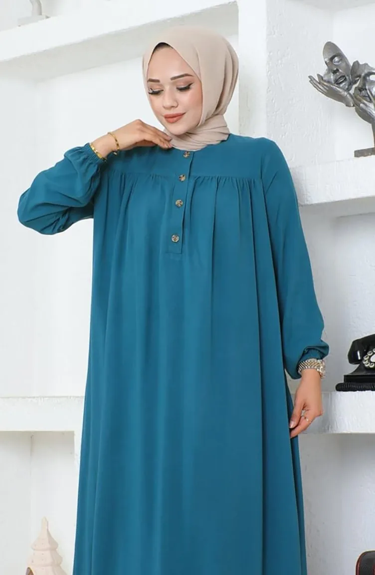 Yarım Düğmeli Viskon Elbise 7103-07 Petrol