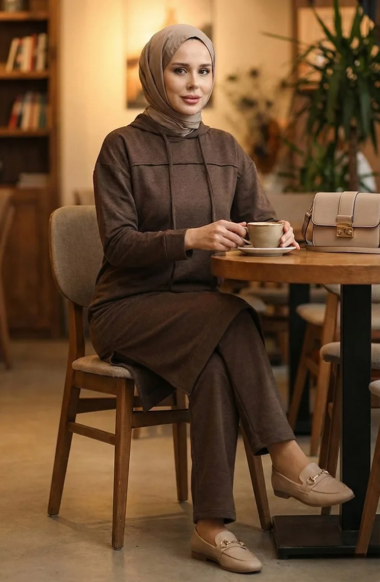 Günlük konfor ve spor şıklığı bir araya getiren bu kahverengi ikili takım, Sefamerve'nin en sevilen tesettür spor giyim parçalarından biridir. Yumuşacık iki iplik kumaşı (Pamuk ve Polyester karışımlı) sayesinde 4 mevsim boyunca konfor sunar.