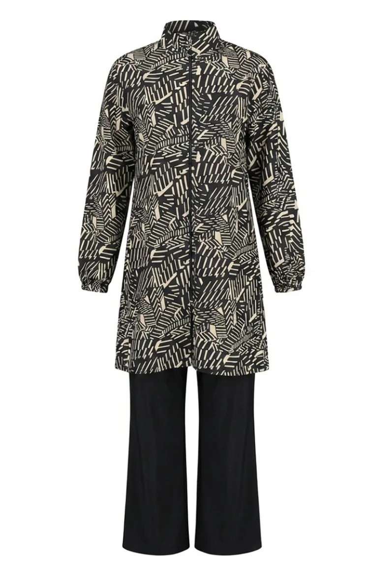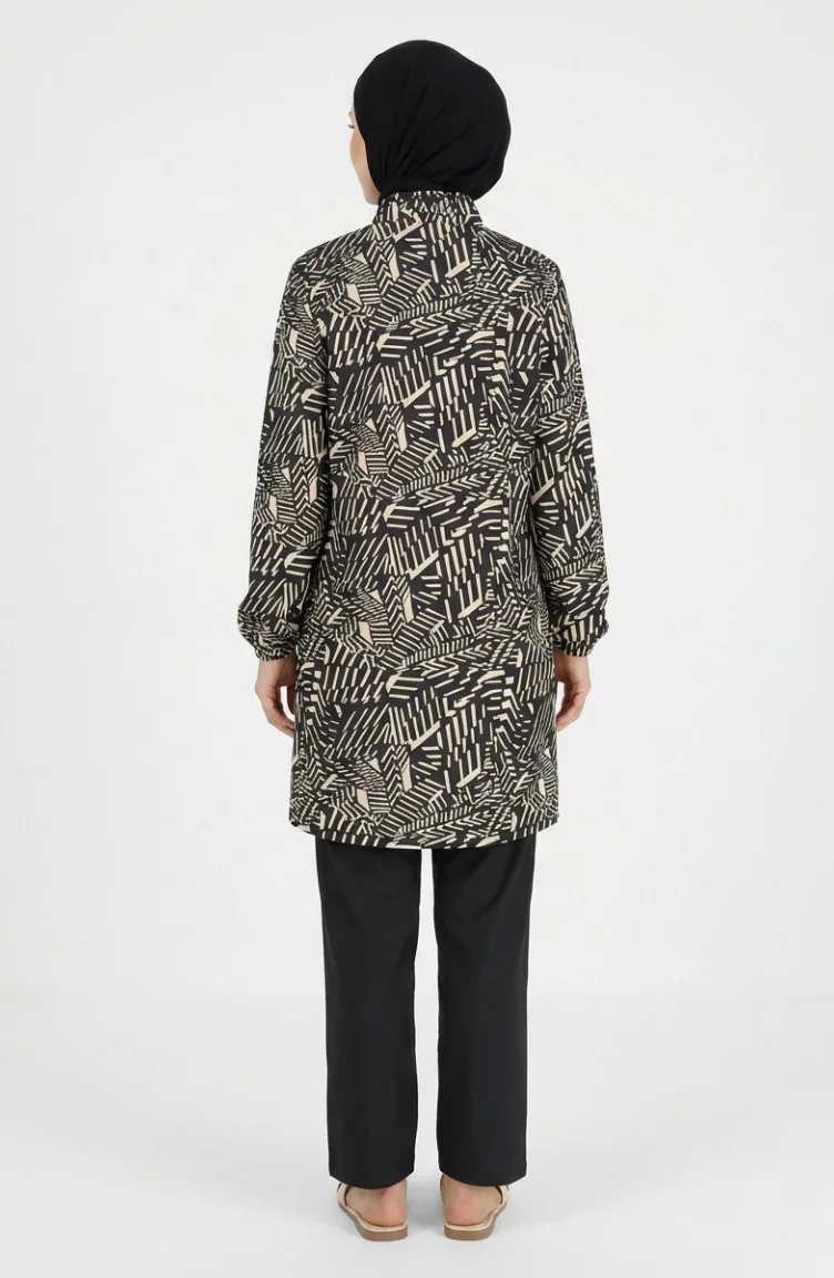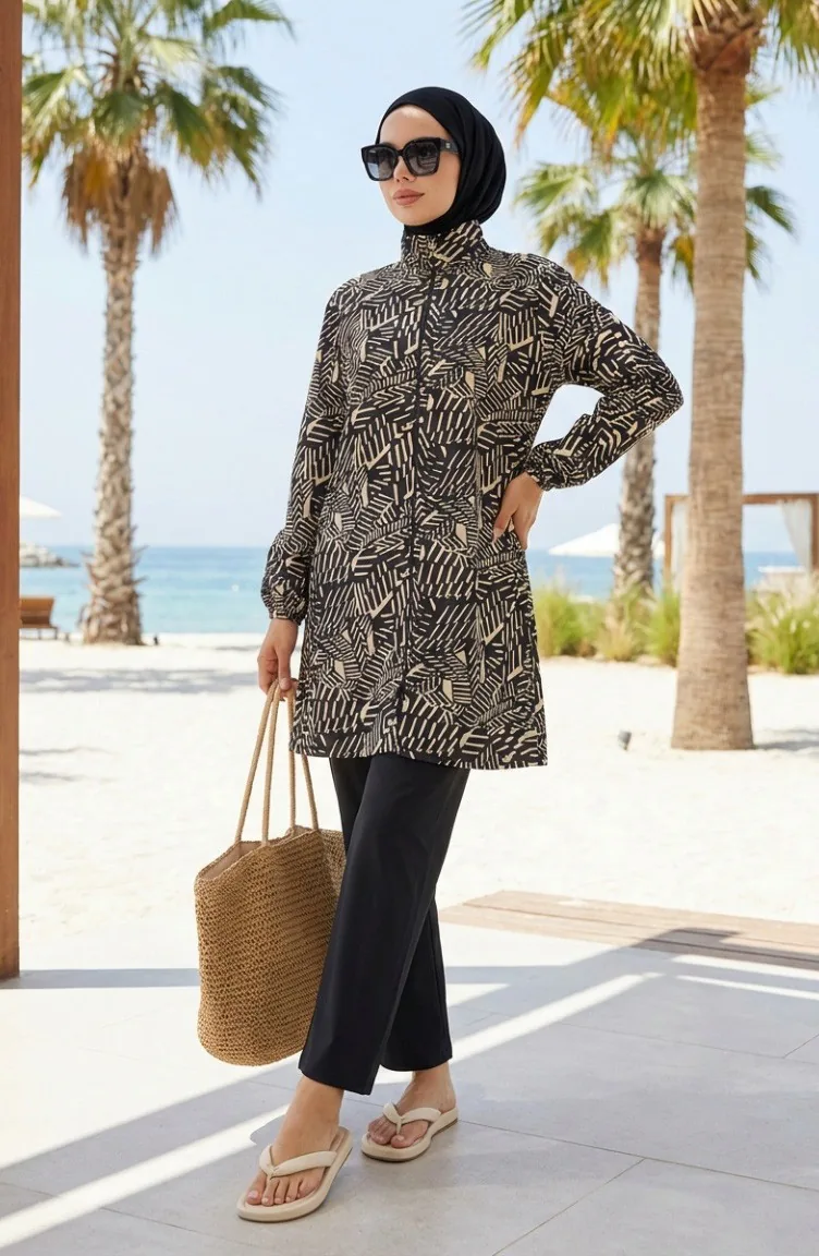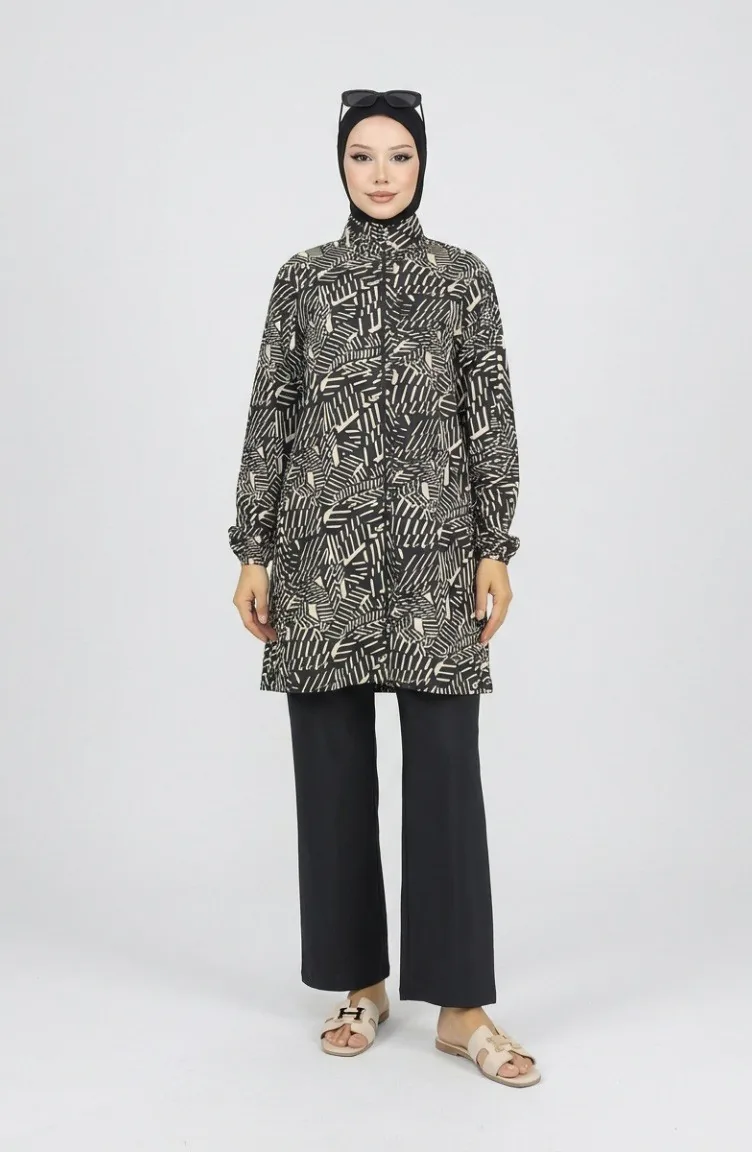 Yaz sezonunun enerjisini plajlara taşıyan Geometrik Desenli 3'lü Tesettür Mayo Takımı, modern tasarımıyla göz kamaştırıyor. %100 polyester kumaş yapısı sayesinde su itici özelliğe sahip olan bu takım, sudan çıktığınızda hızla kuruyarak konforunuzu en üst seviyeye çıkarır.Ürün İçeriği: Üst tunik, pantolon ve bone olmak üzere 3 parçadan oluşmaktadır.Kumaş Özelliği: Hafif yapılı polyester kumaş, hareket özgürlüğü sağlar ve vücuda yapışmaz.Tasarım: Dinamik geometrik desenler, modern muhafazakar giyim estetiğiyle birleşmiştir.Tam kapalı formuyla mahremiyetinizi korurken, nefes alabilen dokusu sayesinde sıcak yaz günlerinde ferah bir kullanım sunar. Denizde ve havuzda kullanım için ideal olan bu model, şıklığı ve fonksiyonelliği bir araya getiren bir yapıdadır. Şık bir plaj çantası ve güneş gözlükleriyle kombinleyerek stilinizi tamamlayabilirsiniz.