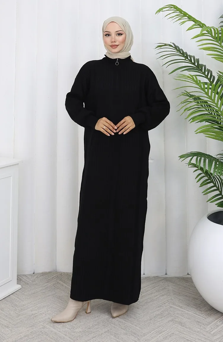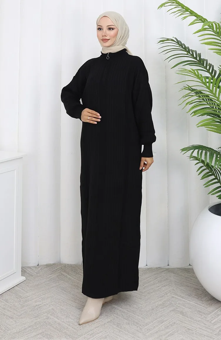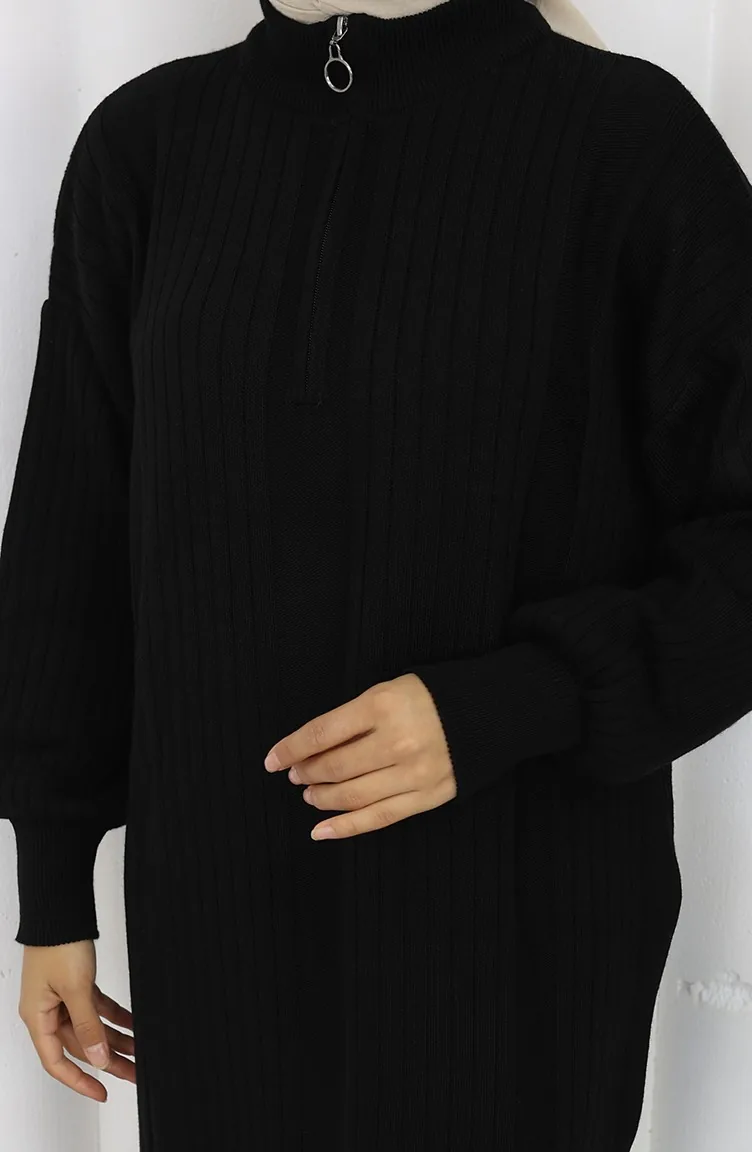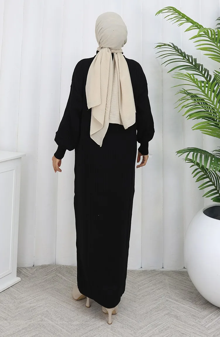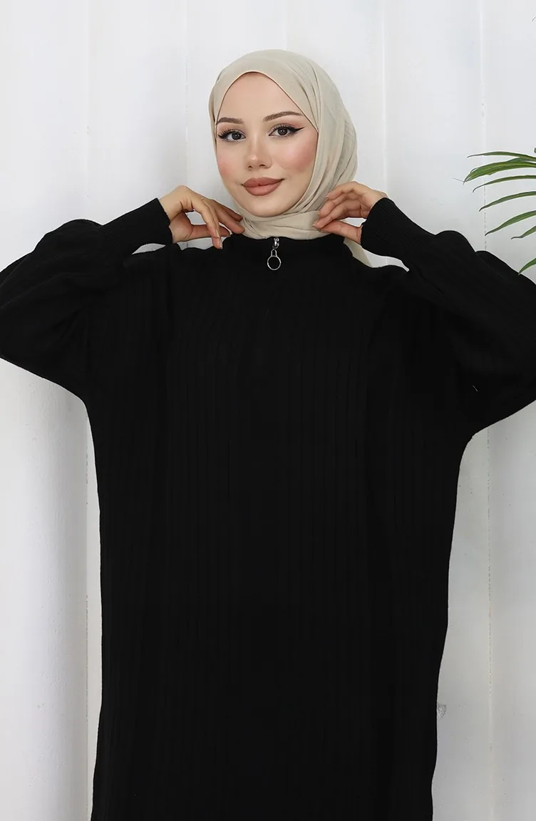 Hijab (tesettür) stilinin en sevilen kışlık parçası: siyah fitilli triko elbise. Modest dress (elbise) koleksiyonunuzun kurtarıcısı olacak bu elbise, islamic clothing (İslami giyim) anlayışına tam uyum sağlar. Fitilli dokusu ve bol kesim (relaxed fit) kalıbı vücudu sarmaz.