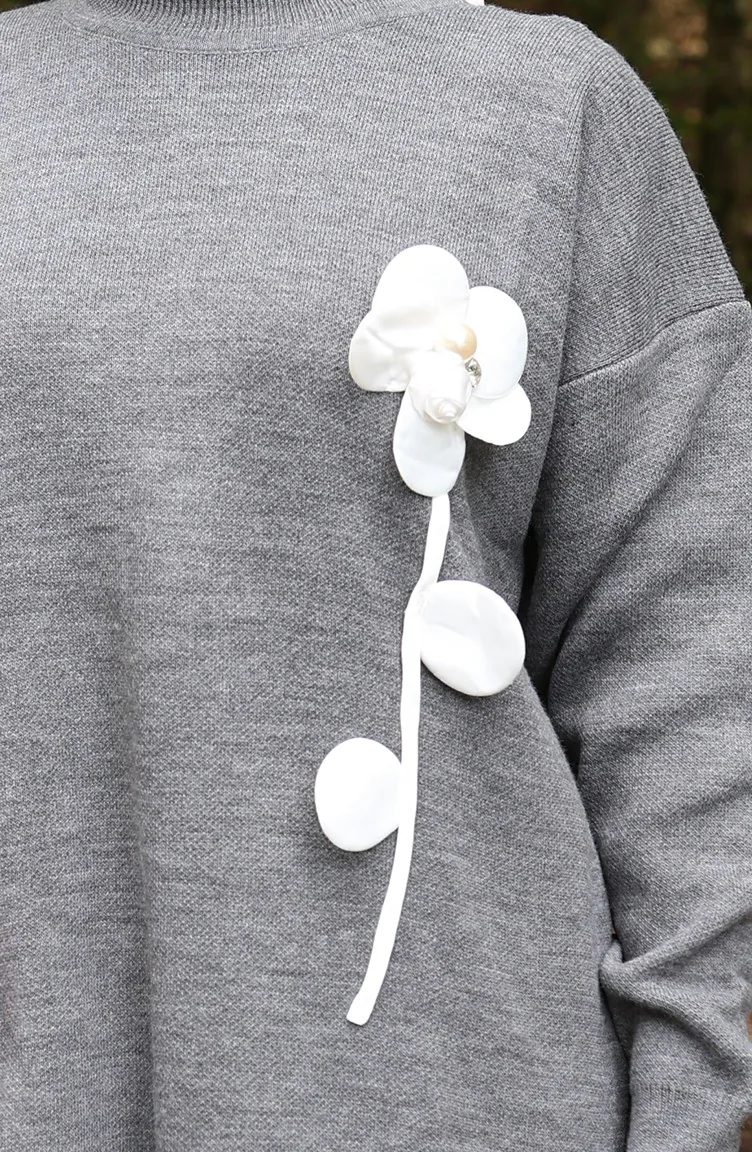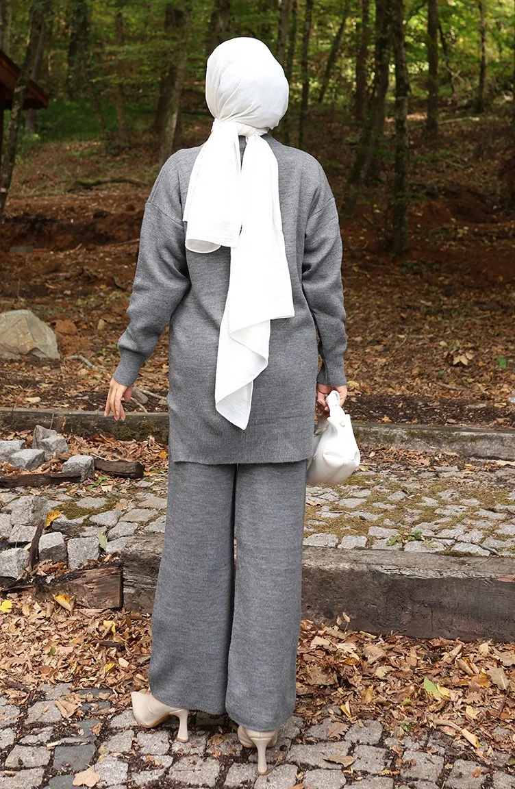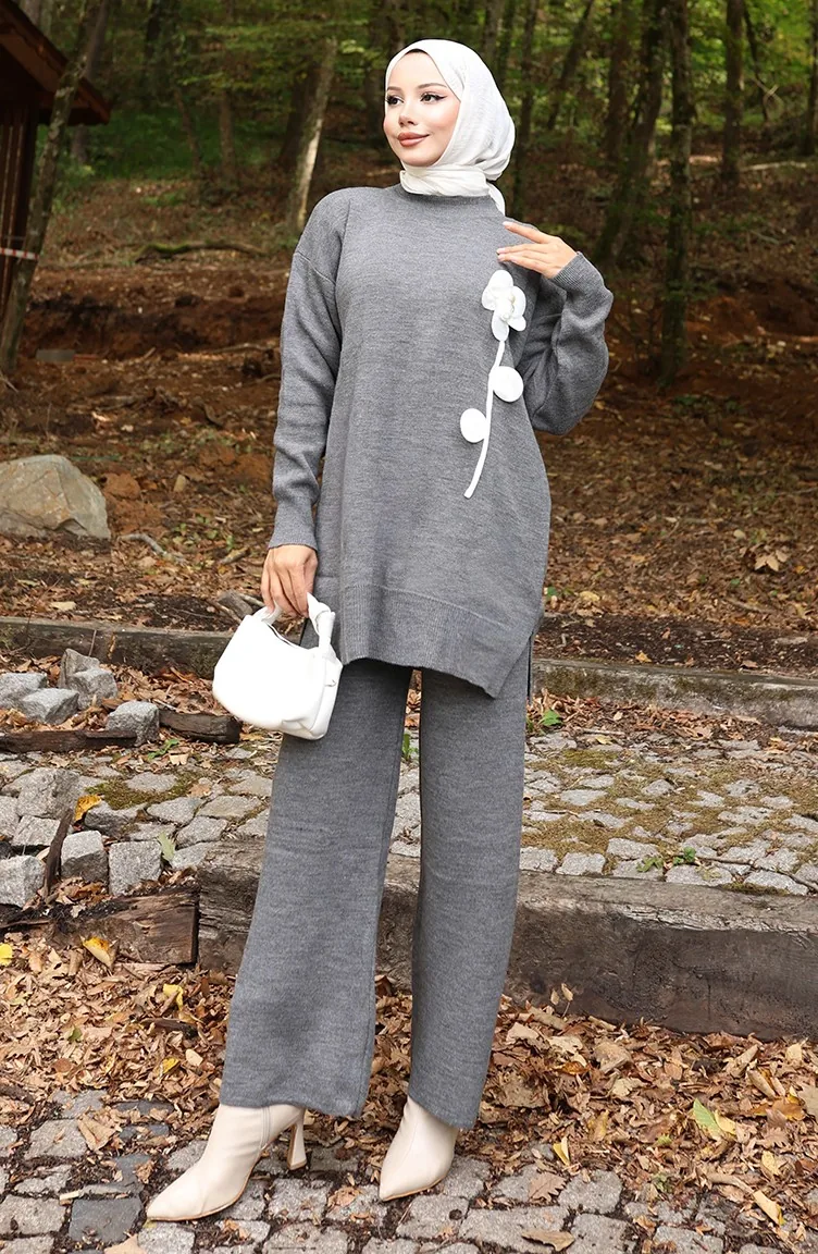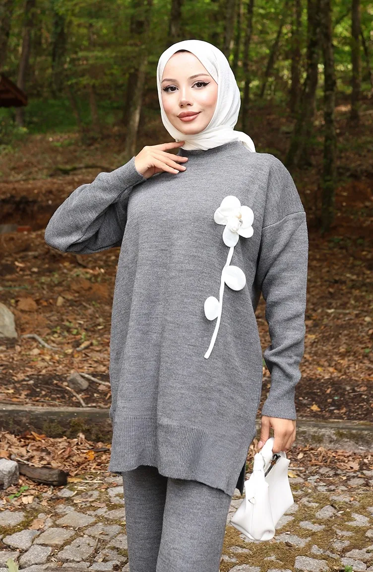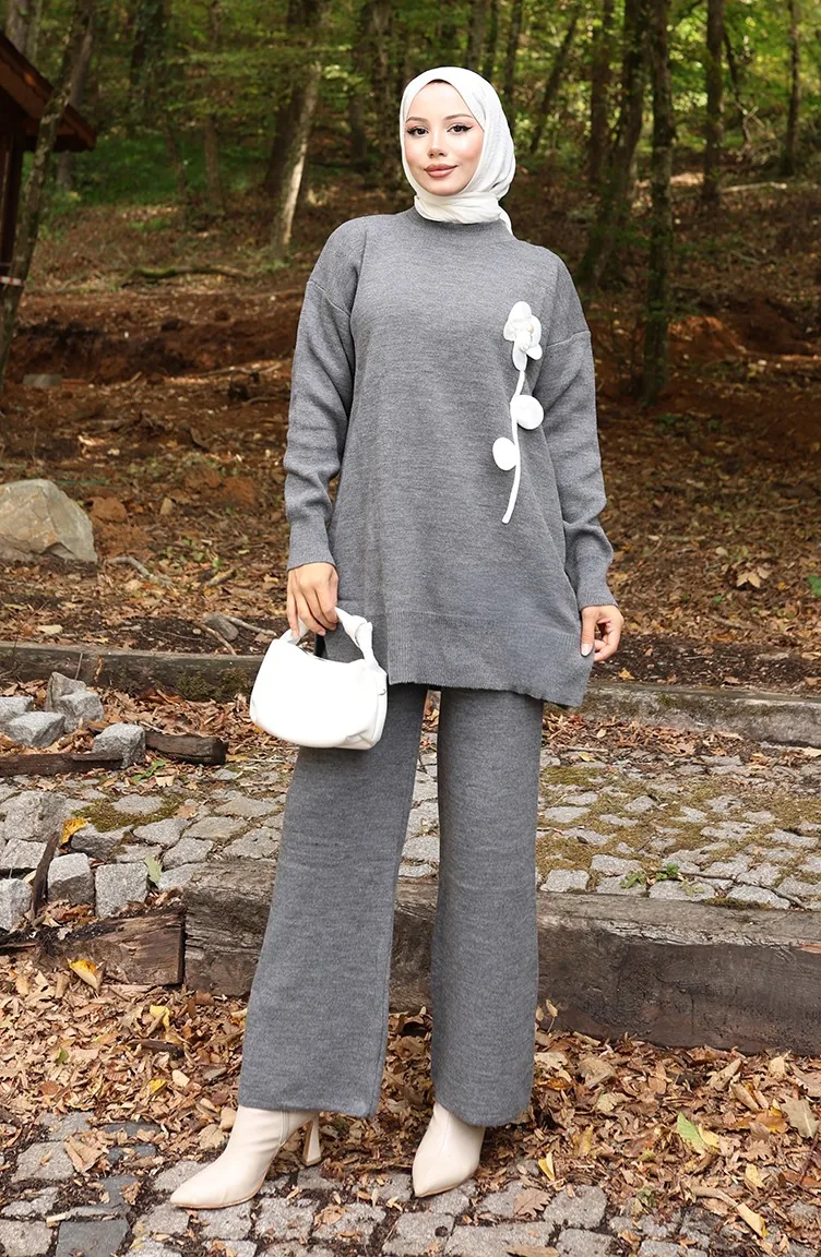 Triko Çiçek Figürlü Tunik Pantolon İkili Takım 1017-04 Gri