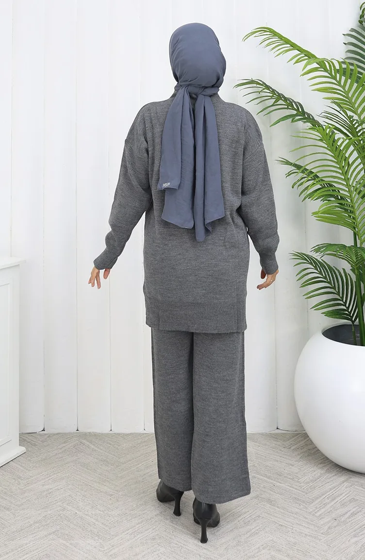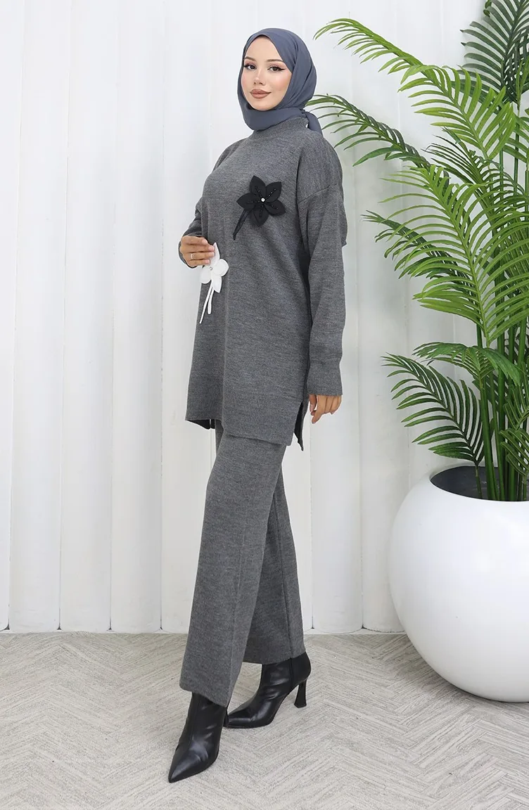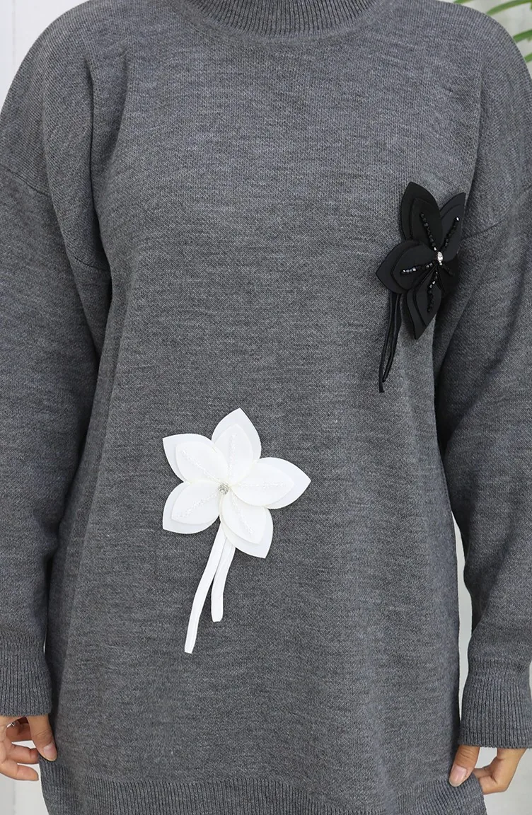 Triko Çiçekli Tunik Pantolon İkili Takım 1077-04 Gri
