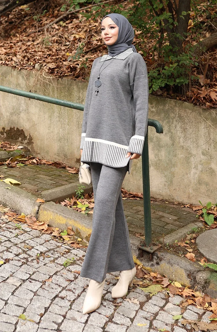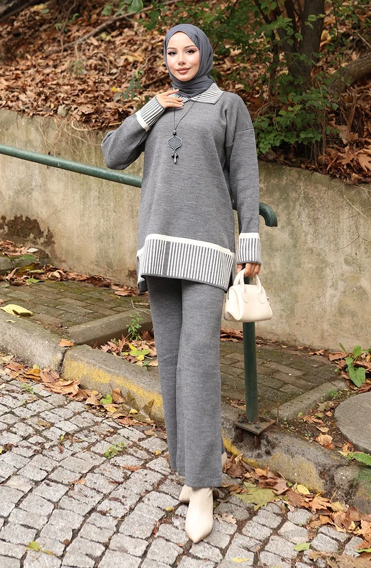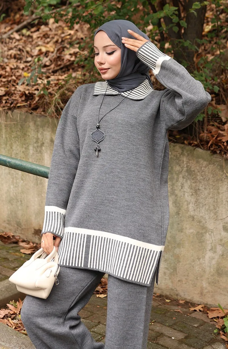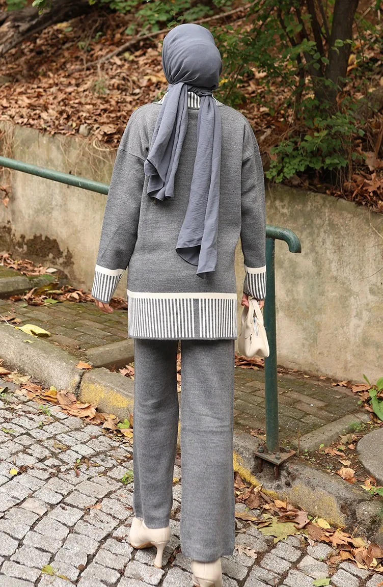 Triko Çizgi Detaylı Tunik Pantolon İkili Takım 1066-06 Gri