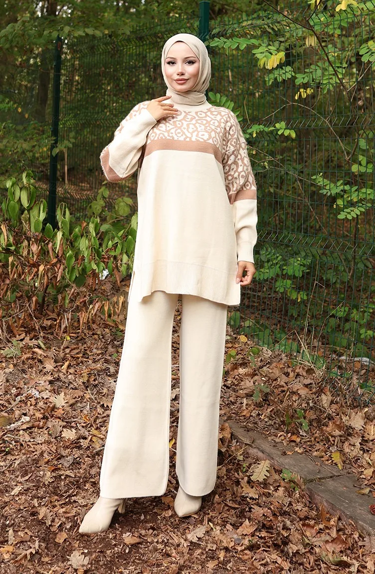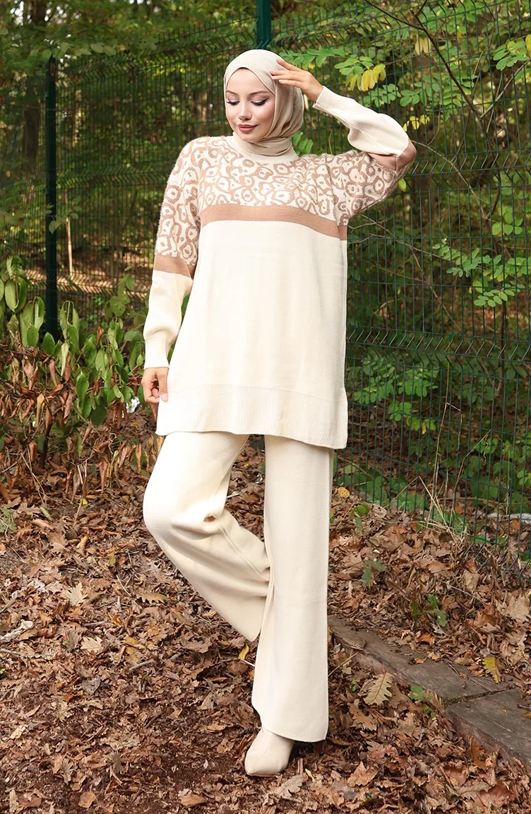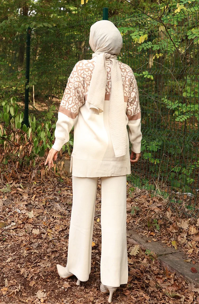 Triko Desenli Garnili Tunik Pantolon İkili Takım 1013-07 Bej