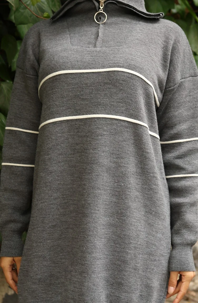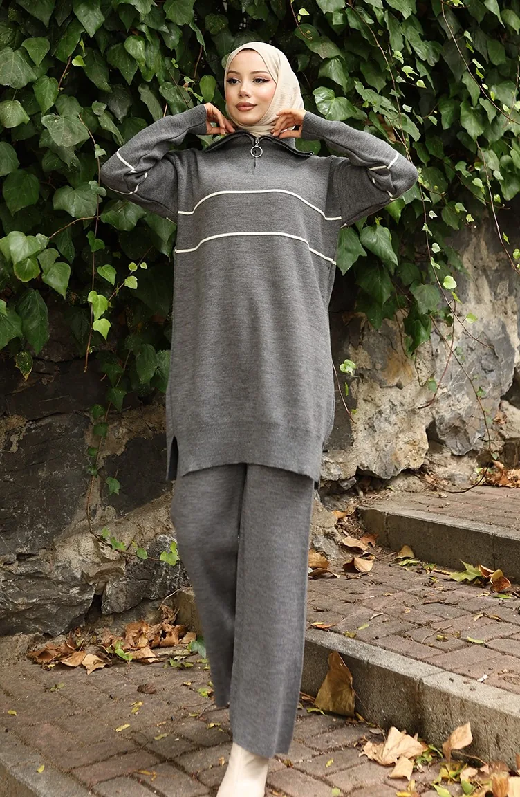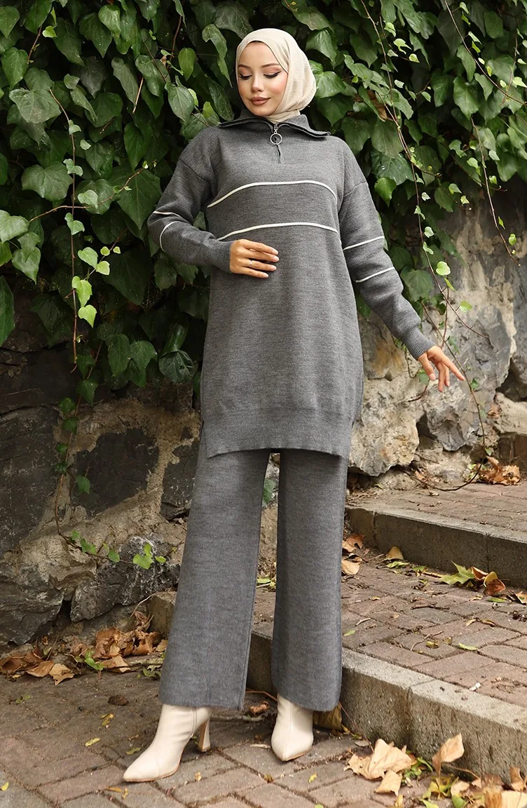 Triko Fermuarlı Tunik Pantolon İkili Takım 1050-01 Gri