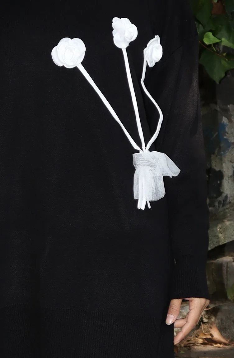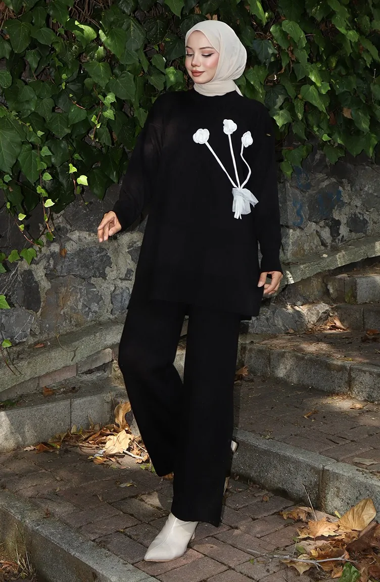 Triko Gül Detaylı Tunik Pantolon İkili Takım 1030-05 Siyah