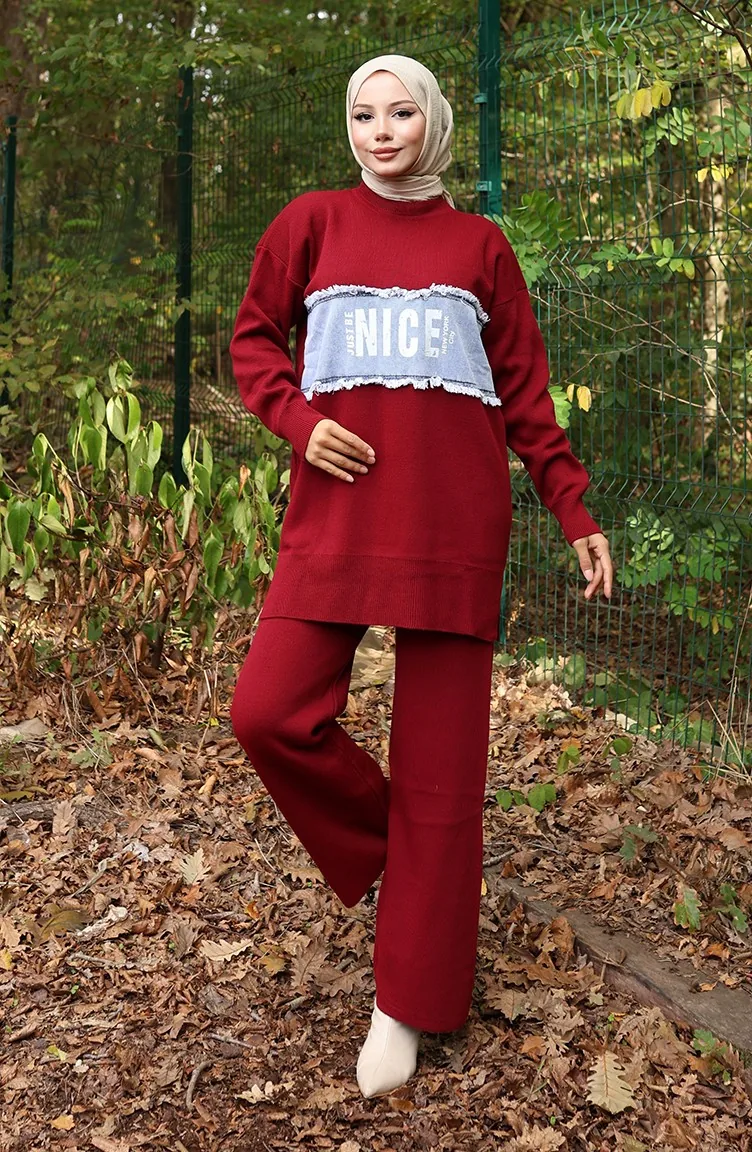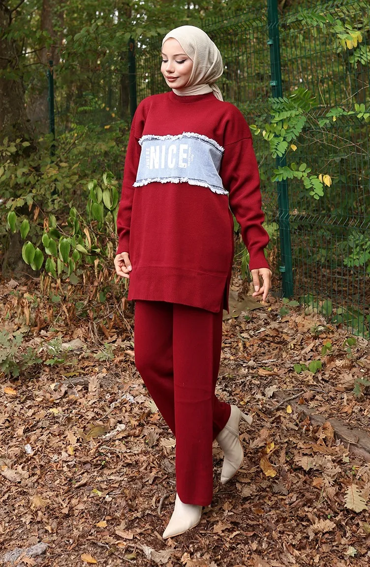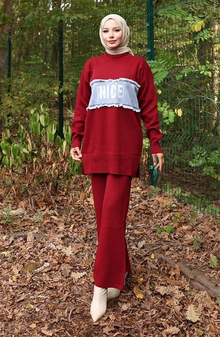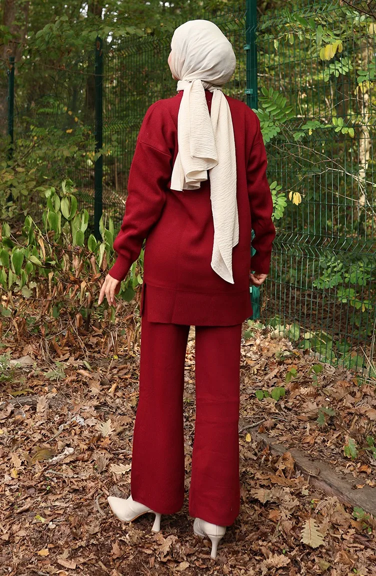 Triko Kot Garnili Tunik Pantolon İkili Takım 1094-07 Bordo