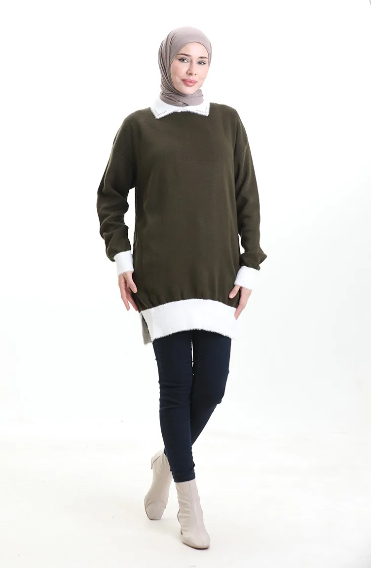 Haki renktedir. Akrilik kumaş. Sade. Tunik. Kışlık. 36-42 Beden aralığındadır.
