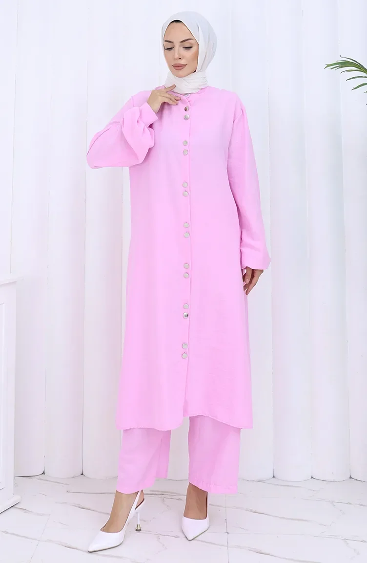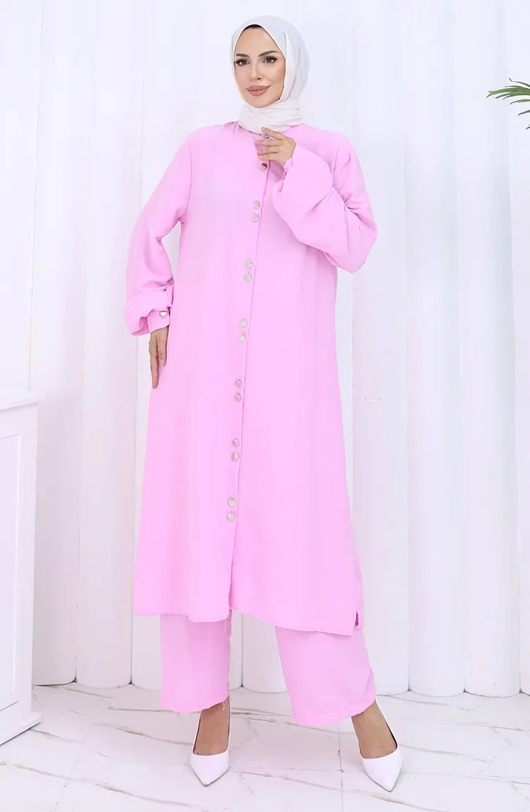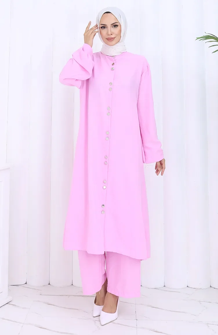 Boydan Düğmeli Tunik Pantolon İkili Takım 2114-04 Pembe