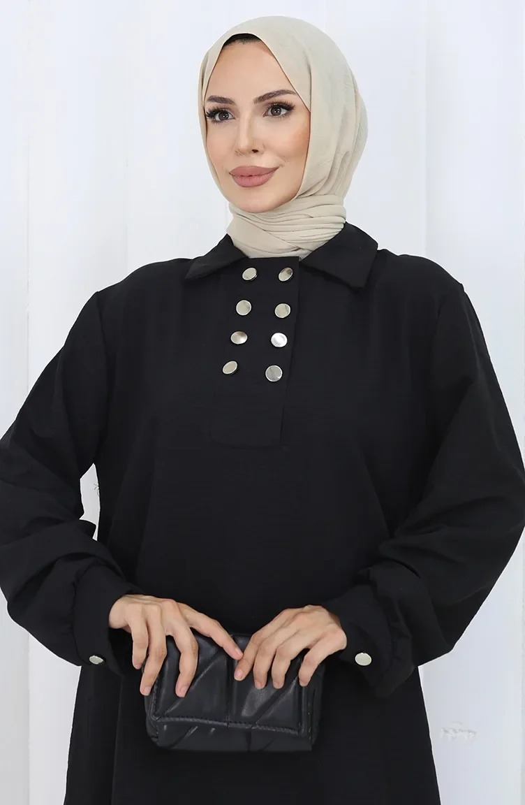 Siyah renktedir. Pamuk dokuma kumaş. Sade. Düğmeli. Gömlek yaka detayı ile kullanışlı modeldir. 4 Mevsim tercih edebilirsiniz. Büyük beden seçeneği mevcuttur.