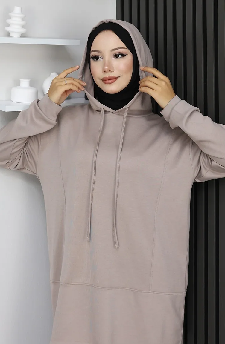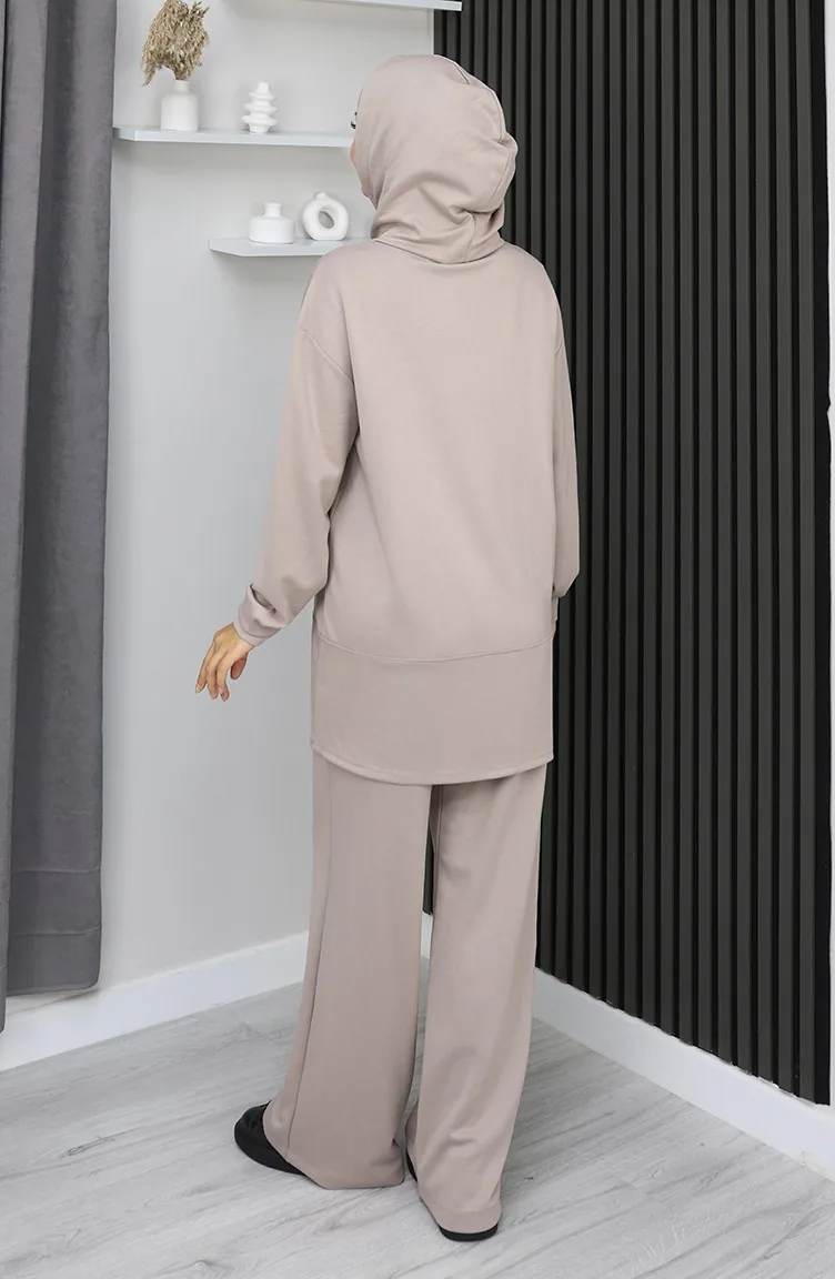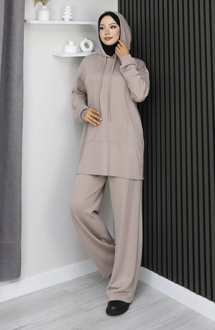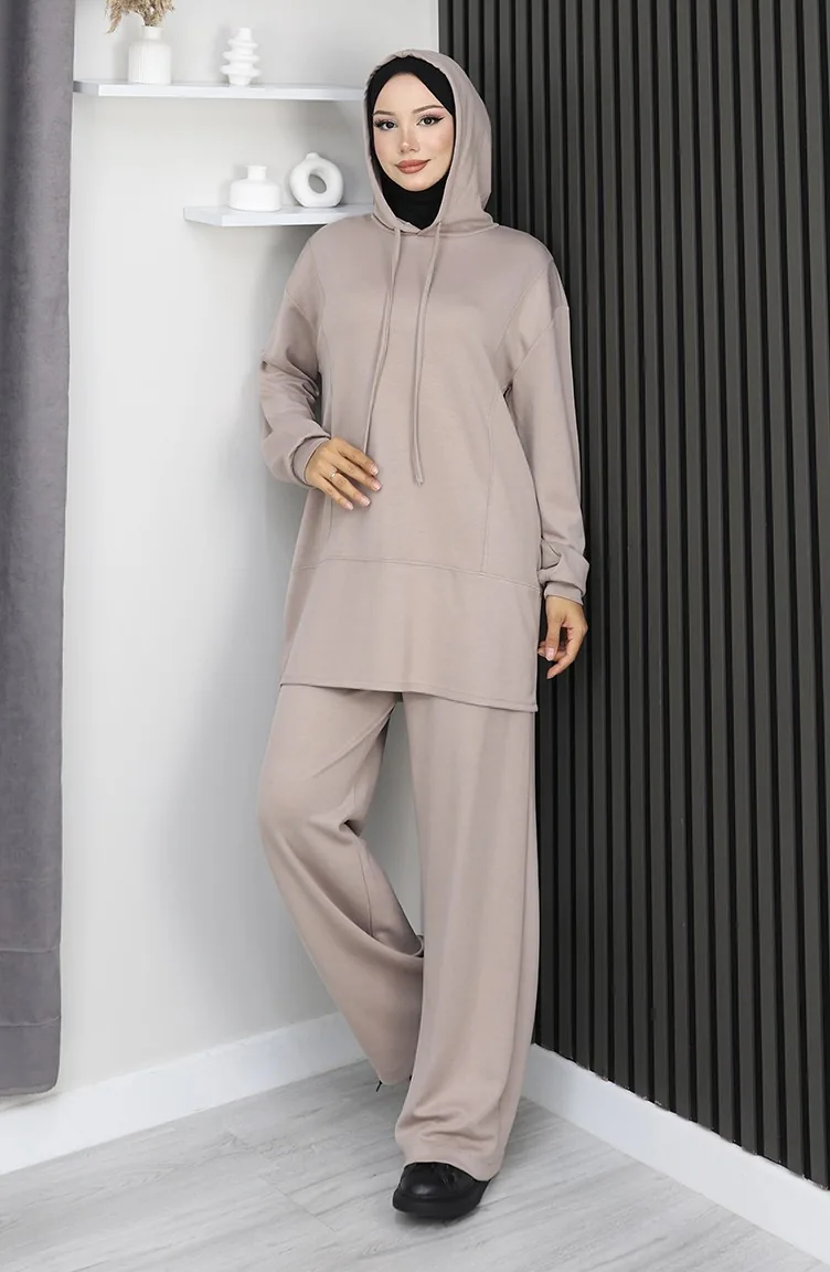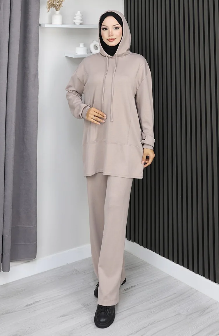 Hijab (tesettür) stilinde "Athleisure" (spor-şık) akımının en trend parçası: vizon (bej) kapüşonlu ikili takım. Modest dress (elbise) yerine mükemmel bir alternatif olan bu tesettür eşofman takımı, islamic clothing (İslami giyim) anlayışına uygun bol kesim (relaxed fit) kalıbıyla gün boyu konfor sağlar.