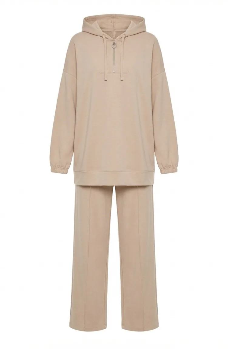 Oysho Kumaş Kapüşonlu Tunik Pantolon İkili Takım 0236-03 Bej