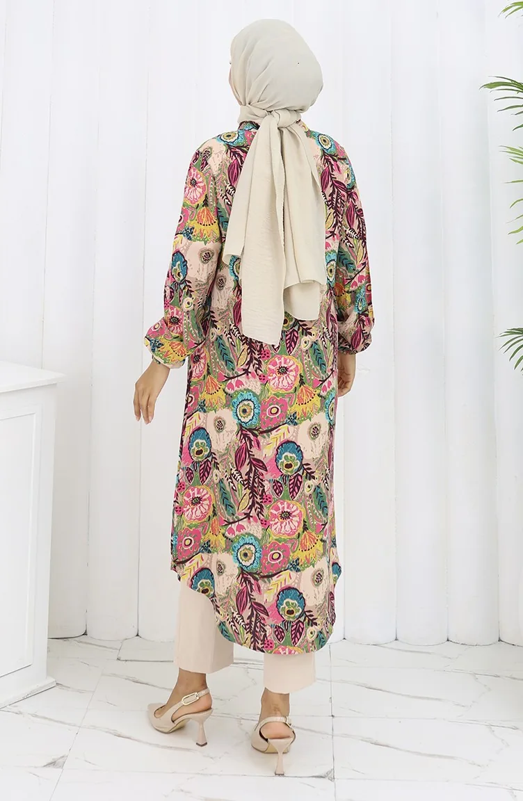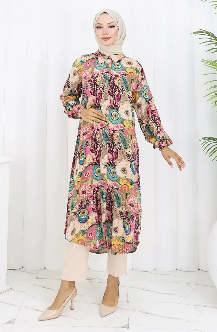 Kolu Lastikli Düğmeli Tunik 0134-04 Turkuaz Bej