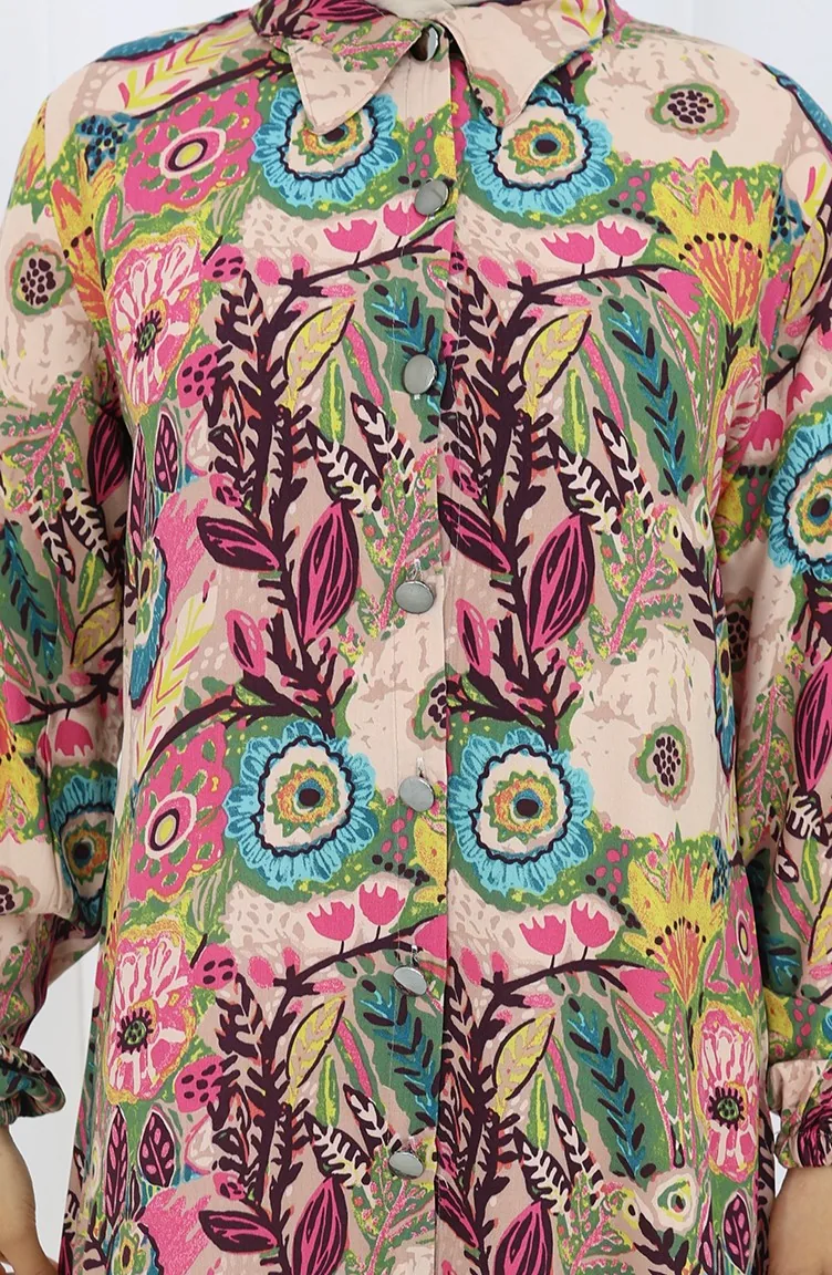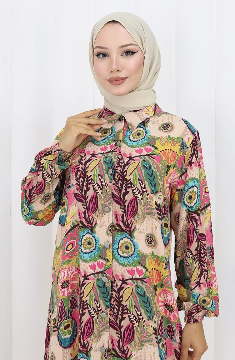 Turkuaz renktedir. Pamuk dokuma kumaş. Desenli kumaş. Düğmeli. Lastik kollu. 4 Mevsim tercih edebilirsiniz. Büyük beden seçeneği mevcuttur.