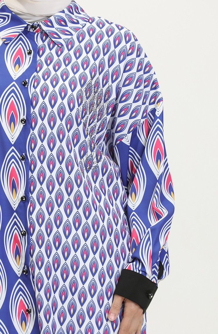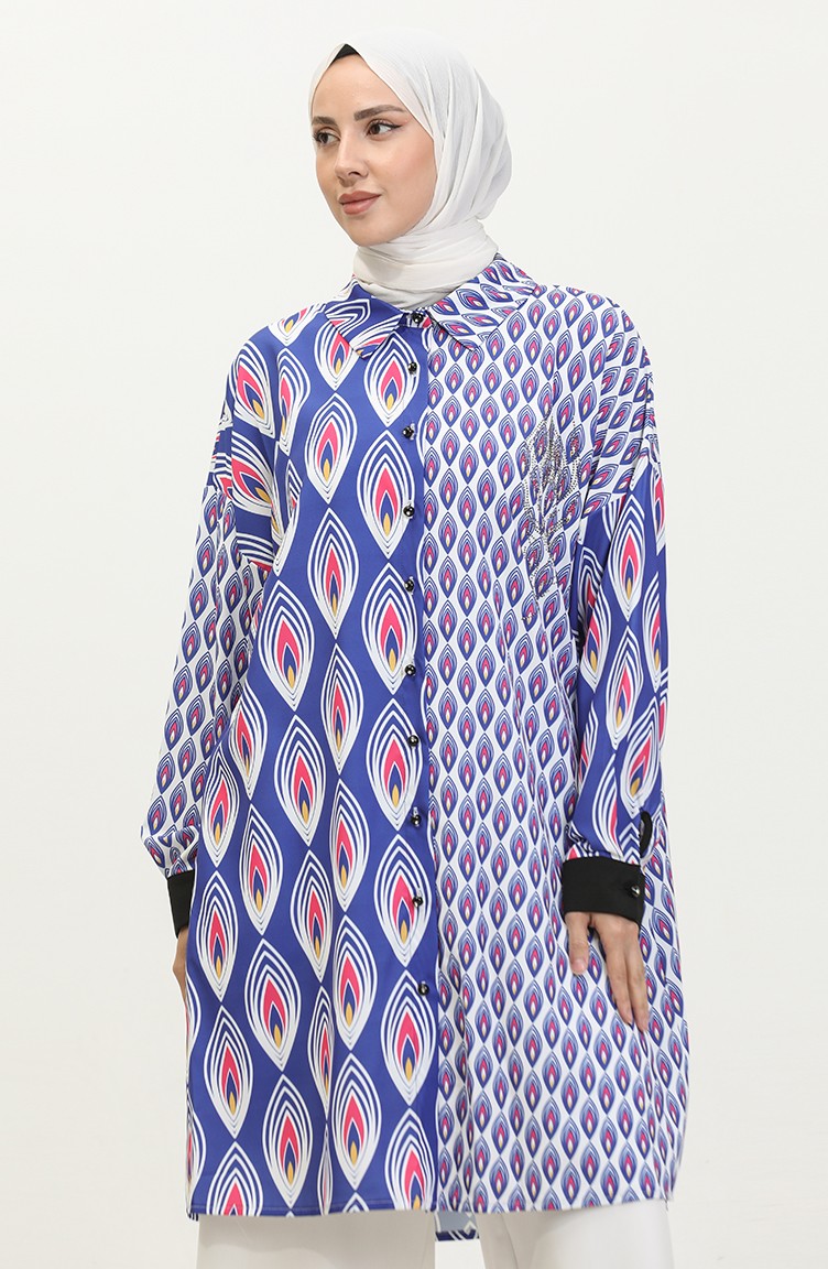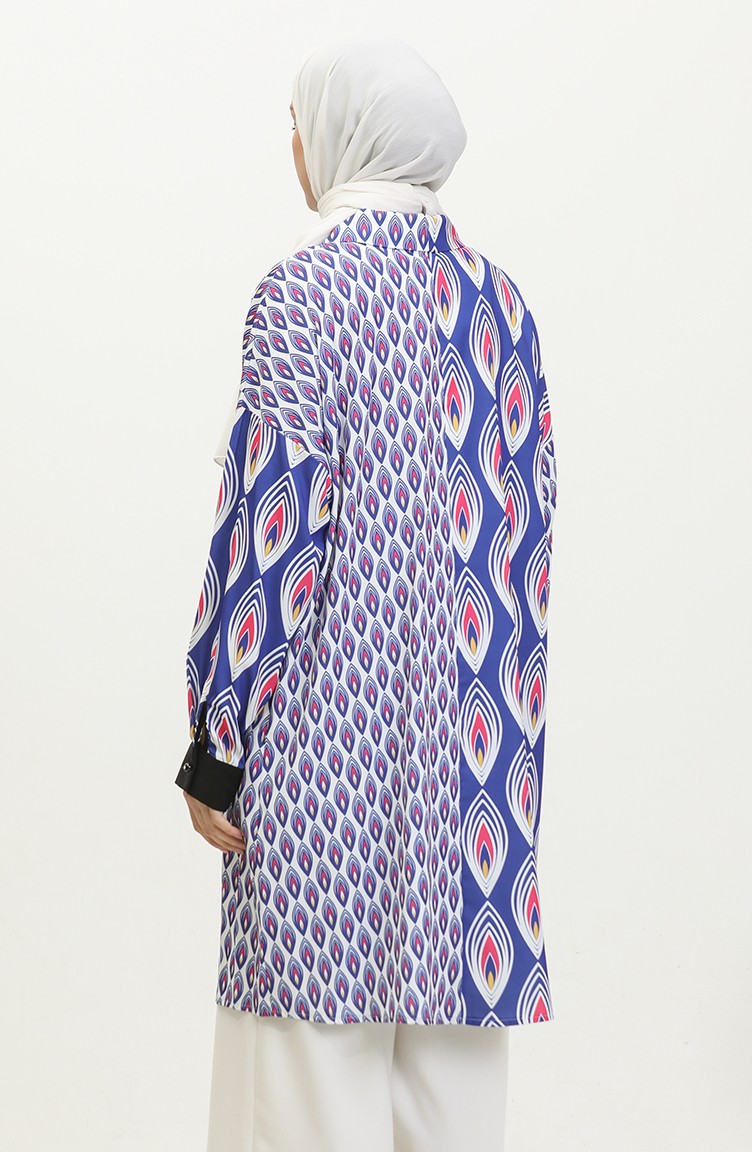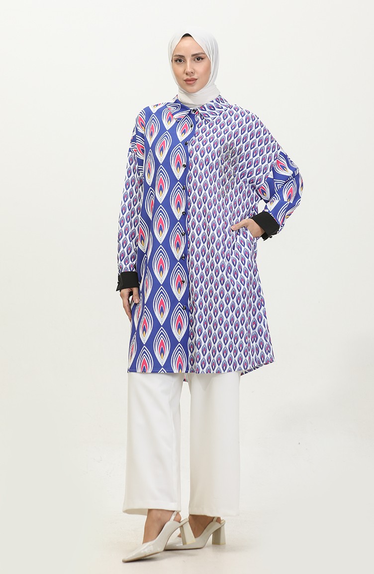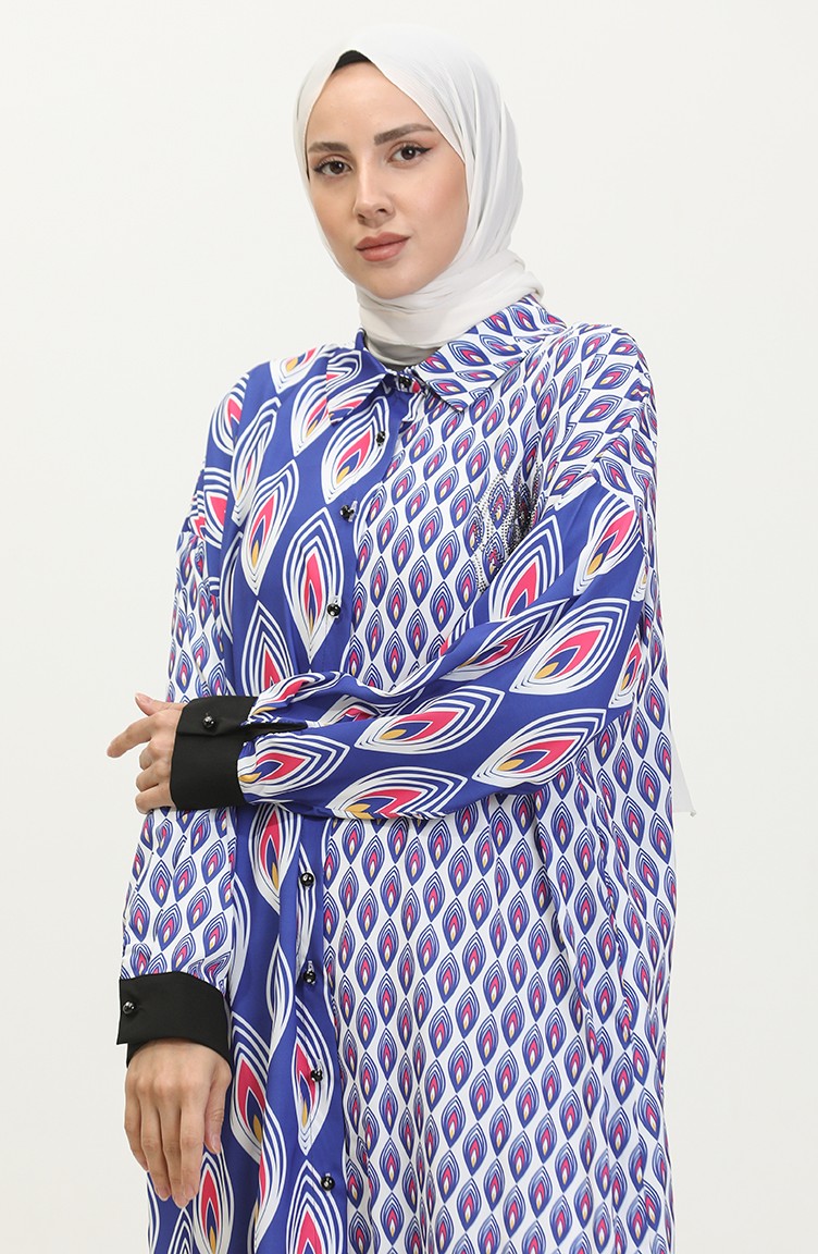Mavi renktedir. Polyester kumaş. Desenli kumaş. Yazlık. Büyük beden seçeneği mevcuttur.