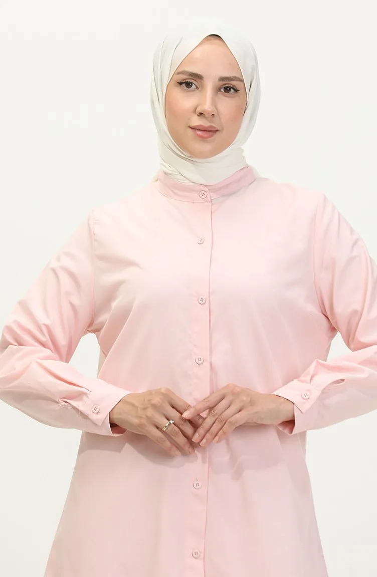 Pudra renktedir. Koton kumaştır. Sade. Düğmeli. Uzun kolludur. Hakim yaka detayı ile kullanışlı modeldir. Yazlık. Büyük beden seçeneği mevcuttur.