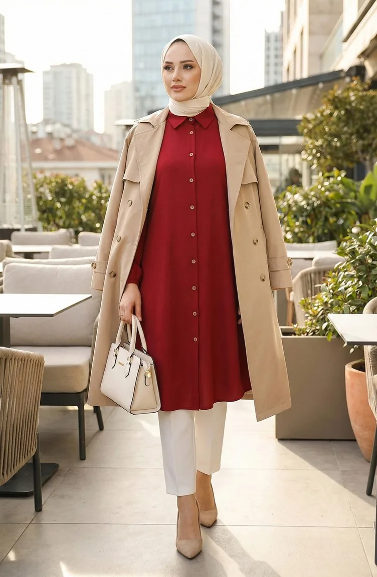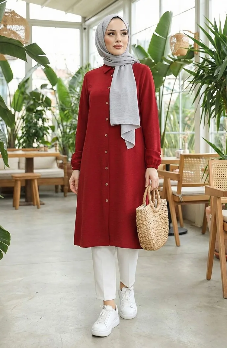 Klasik zarafetin Kırmızı tonu: Lastik Kollu Viskon Tesettür Tunik. Akışkan ve nefes alan viskon kumaşı sayesinde 4 mevsim kullanıma uygundur. Gömlek yaka ve gizli düğme detayıyla şık bir görünüm sunar. Büzgülü lastikli kol manşetleri modern bir detaydır. Uzun ve dökümlü kesimiyle sade bir şıklık sağlar. Ofis şıklığı ve özel günler için idealdir. Boyu uzun gösteren bu tunik, gardırobunuzun temel parçası olmaya adaydır.